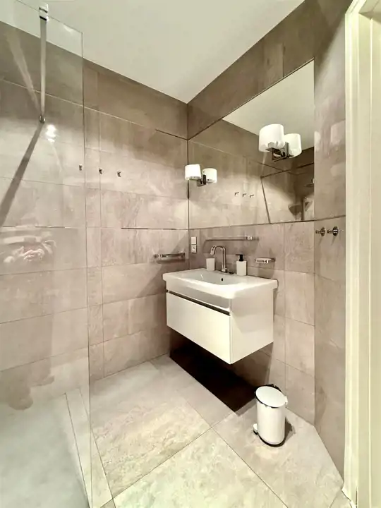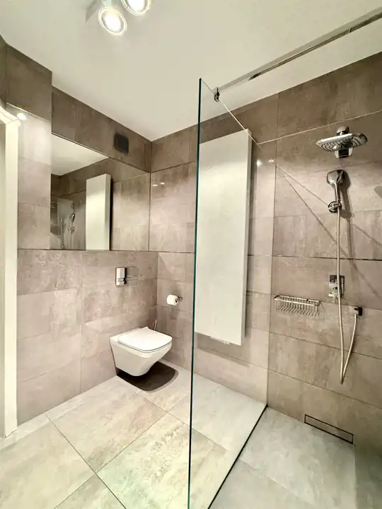 - łazienki z prysznicem typu walk in i elegancką armaturą