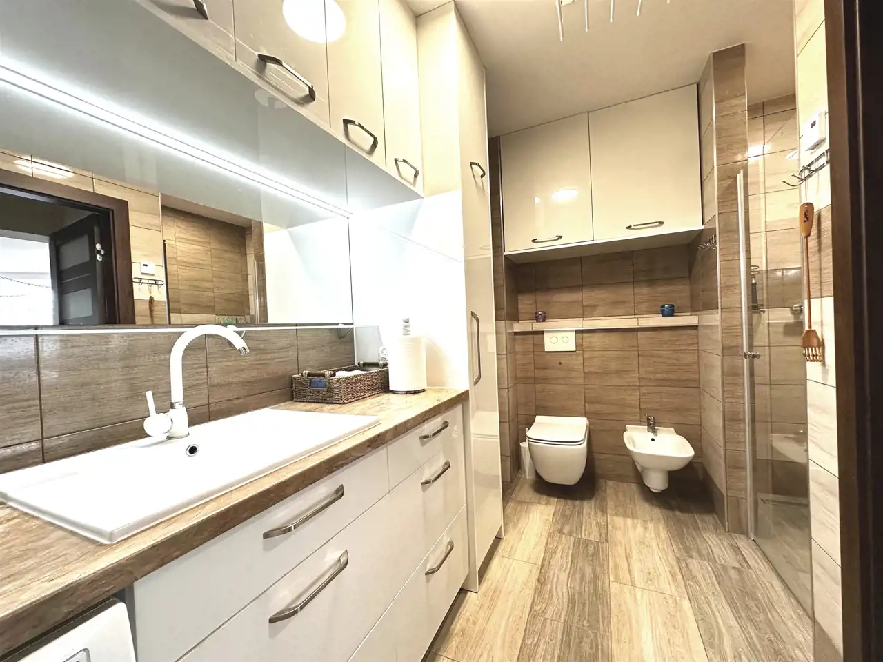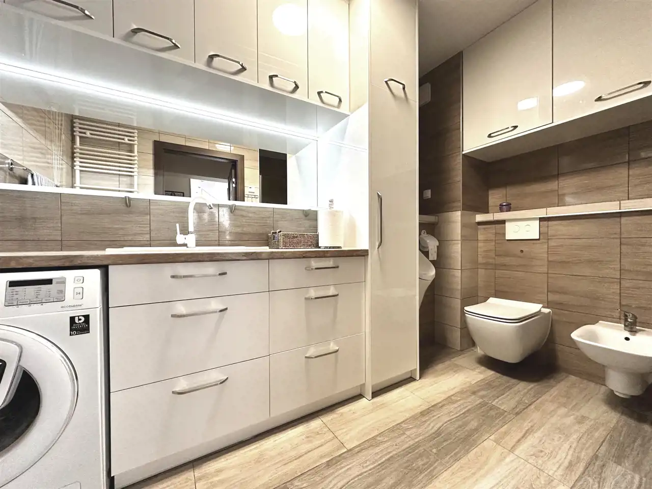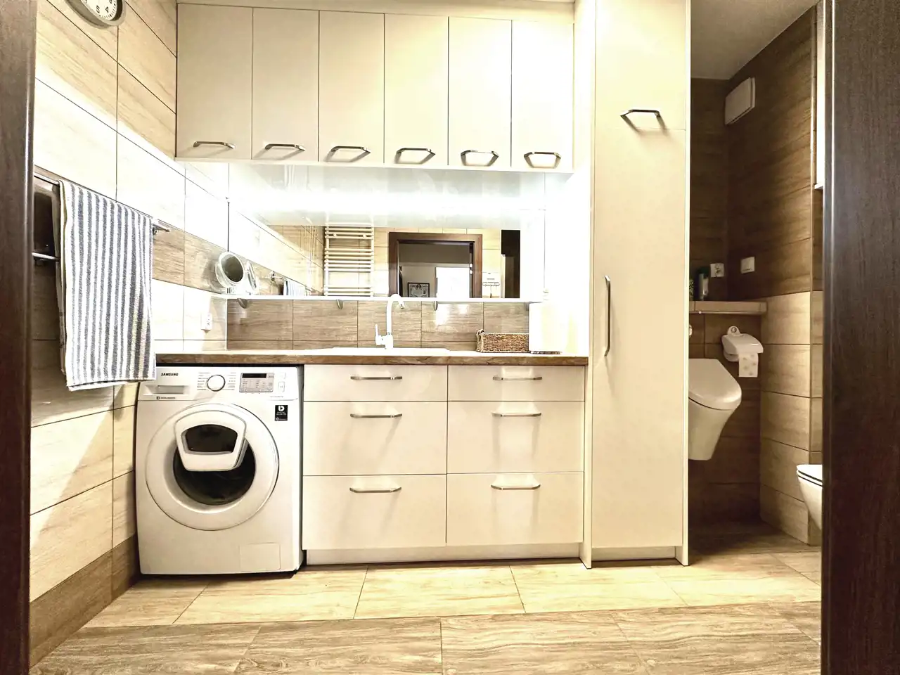 Funkcjonalna łazienka z prysznicem, umywalką, licznymi szafkami, pralką, wc i bidetem oraz pisuarem.