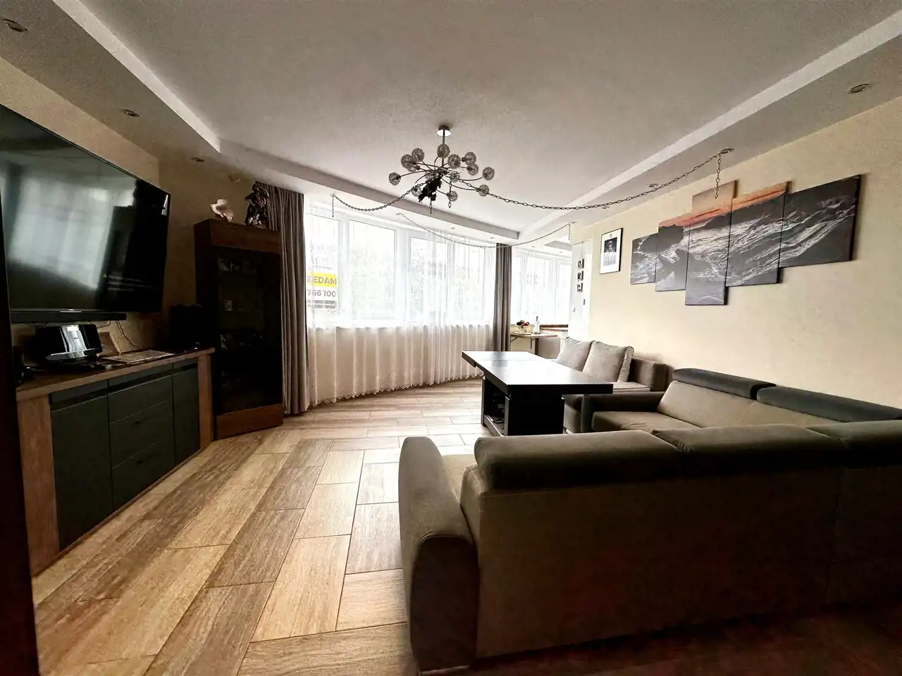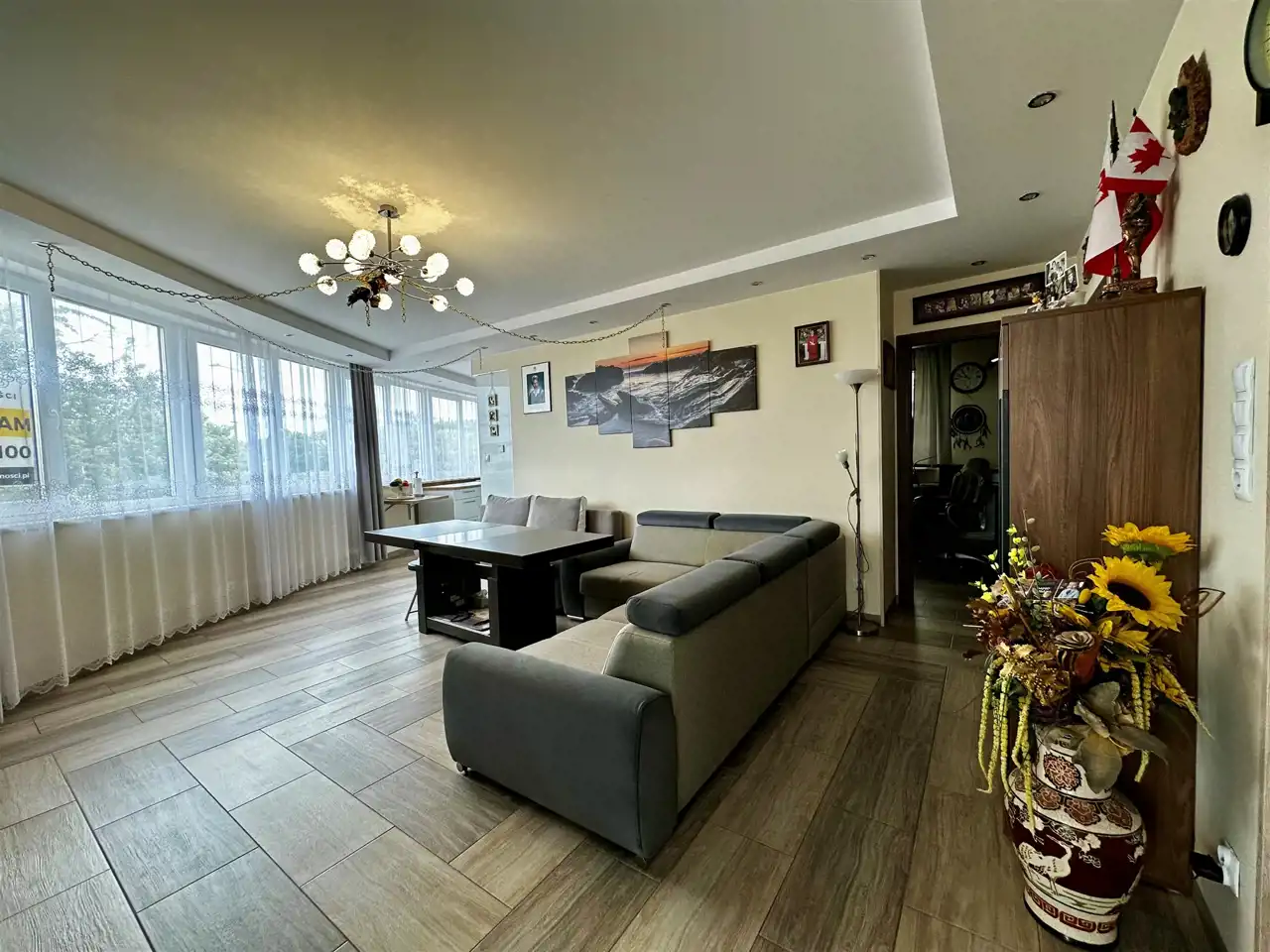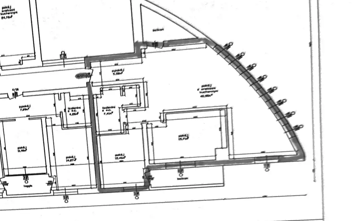 Salon z balkonem na stronę północną i wschodnią, z ciekawa łukową ścianą i licznymi oknami.