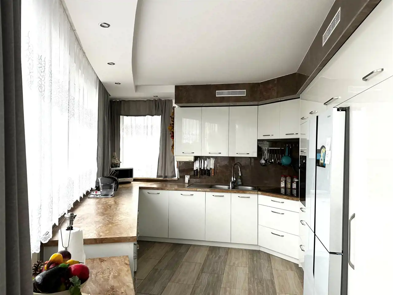 Duża kuchnia z licznymi sprzętami w zabudowie: