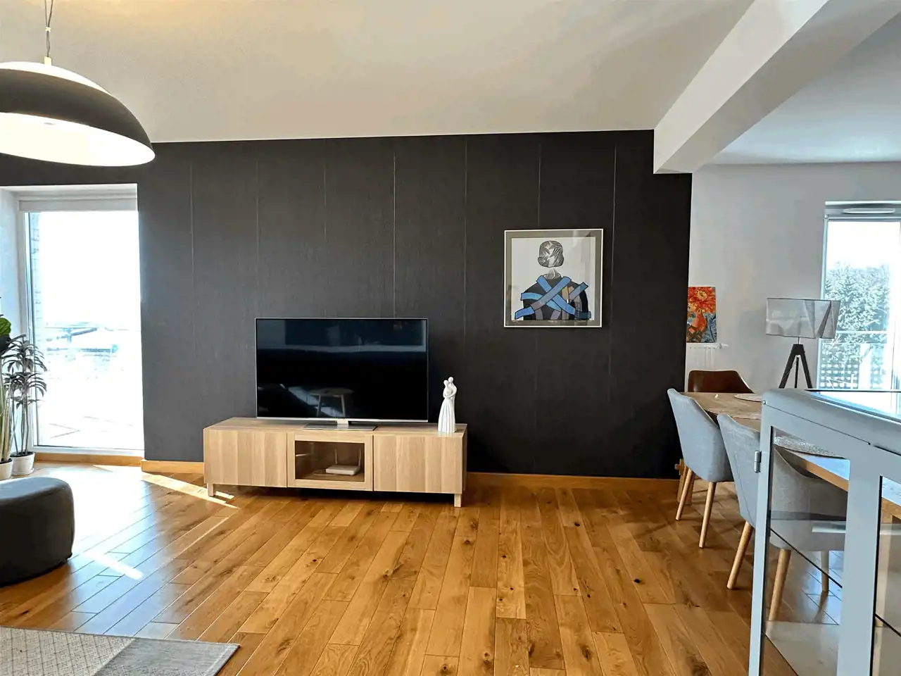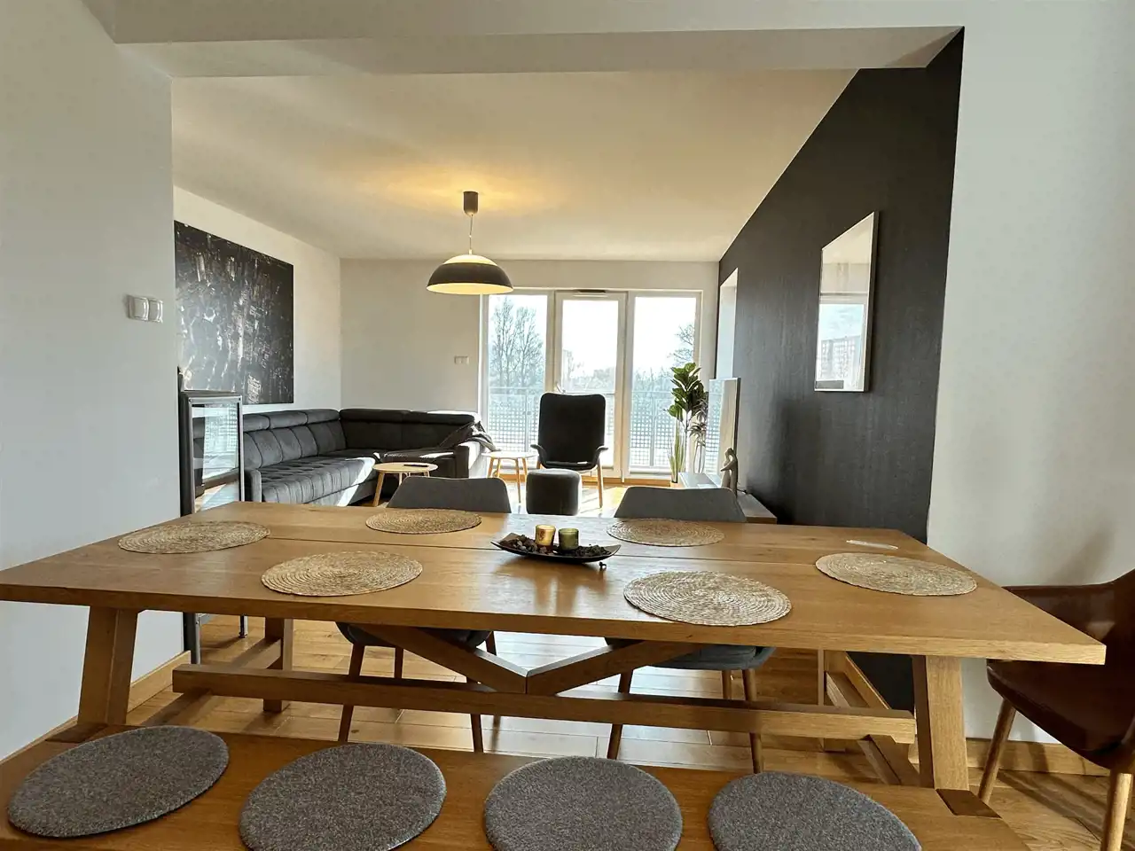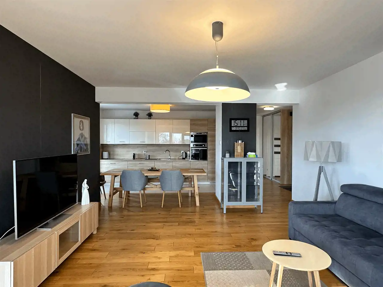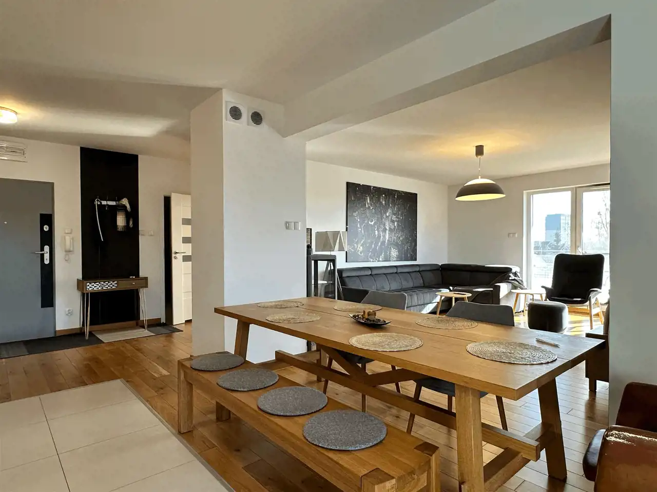 oraz przestronnym salonem z jadalnią i otwartą kuchnią.