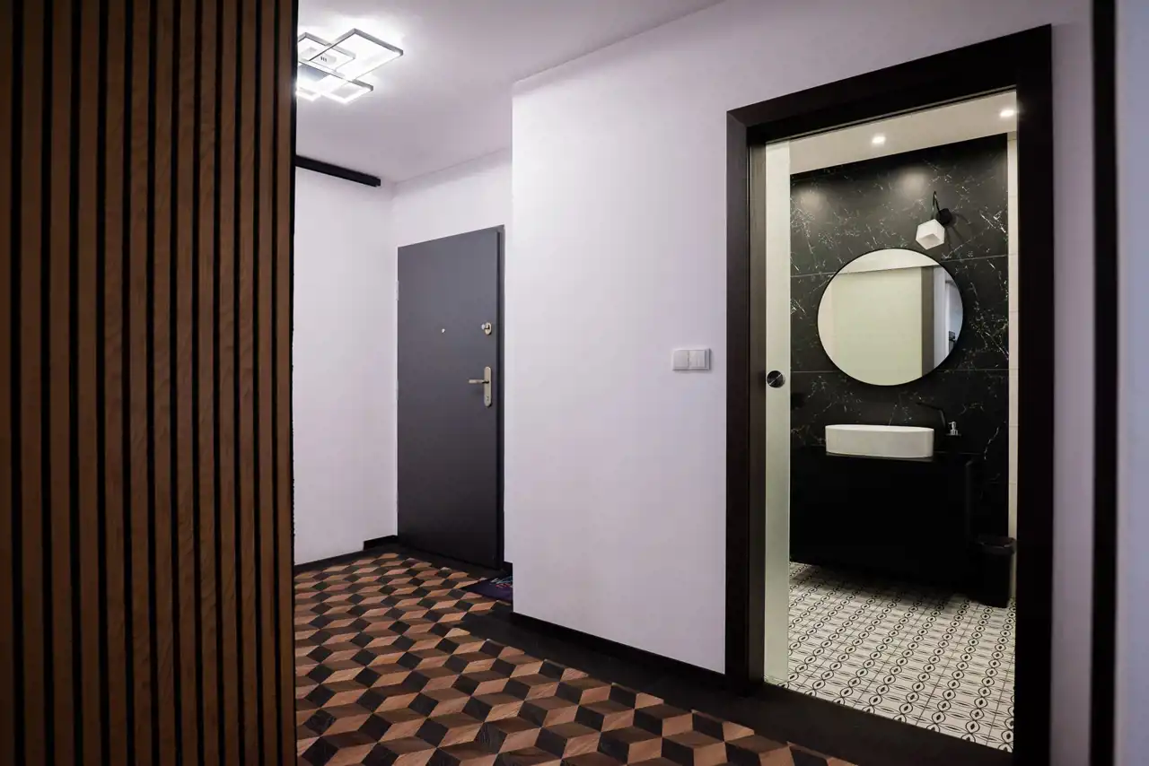 Łazienka to poziom, który zwykle widzi się w dobrych hotelach czarny i biały marmur, minimalistyczna forma, dopracowane detale.