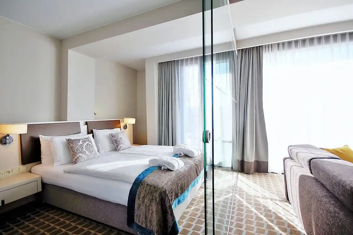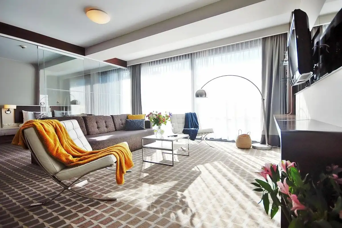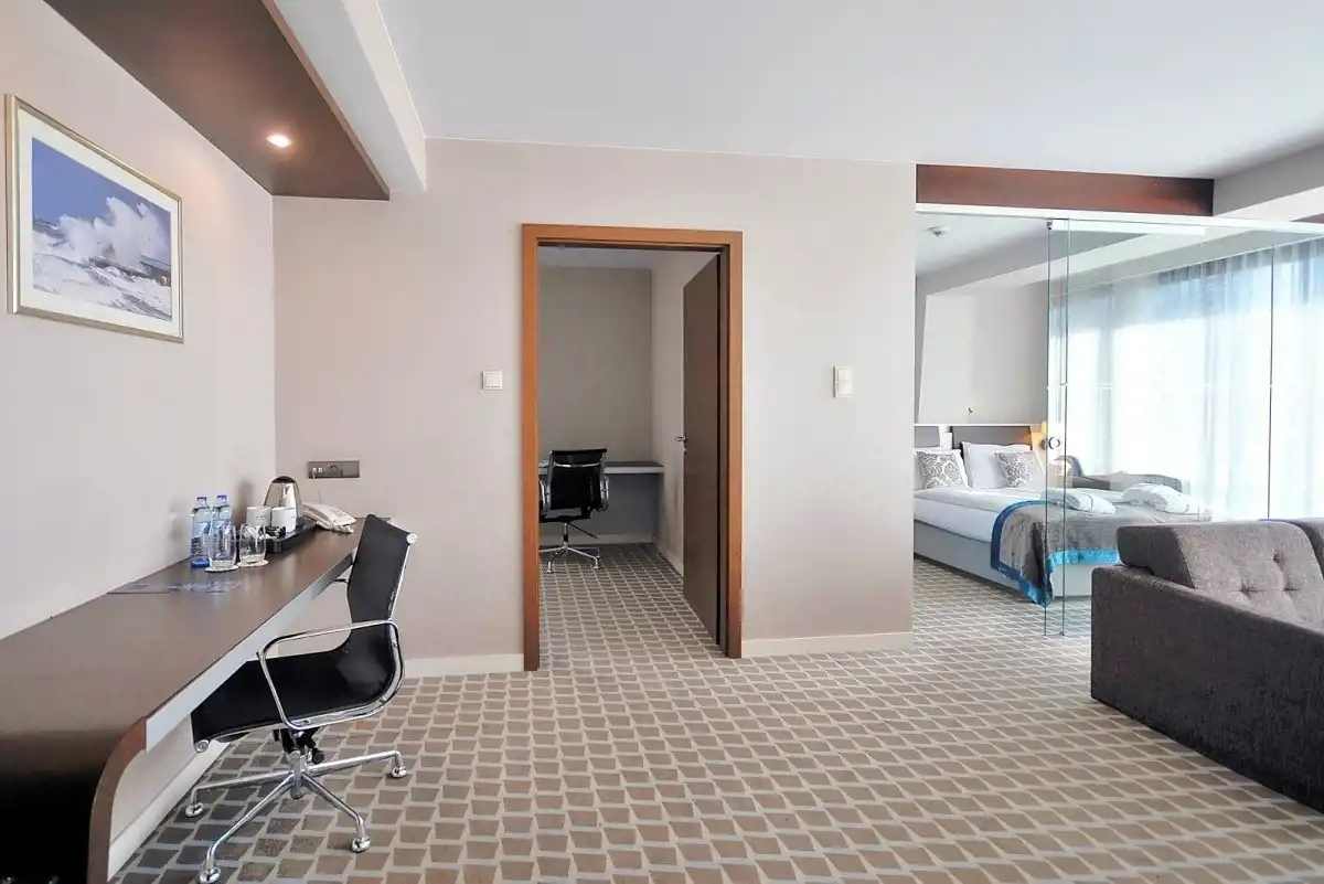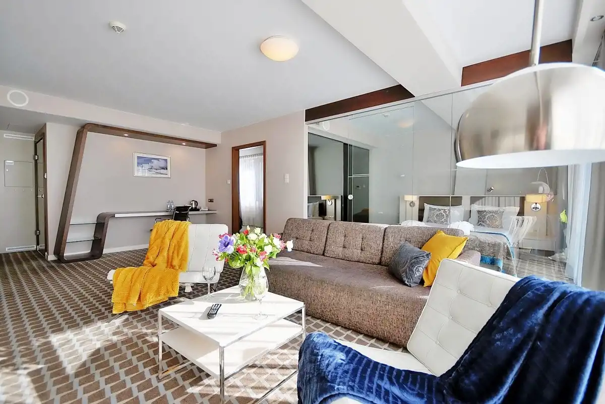 - możliwość korzystania z infrastruktury hotelu: basen, spa & wellness, siłownia, kawiarnia widokowa, restauracja itp;