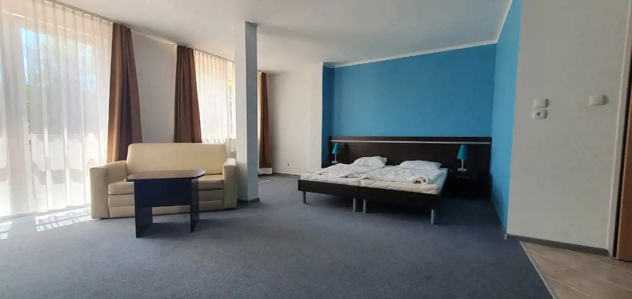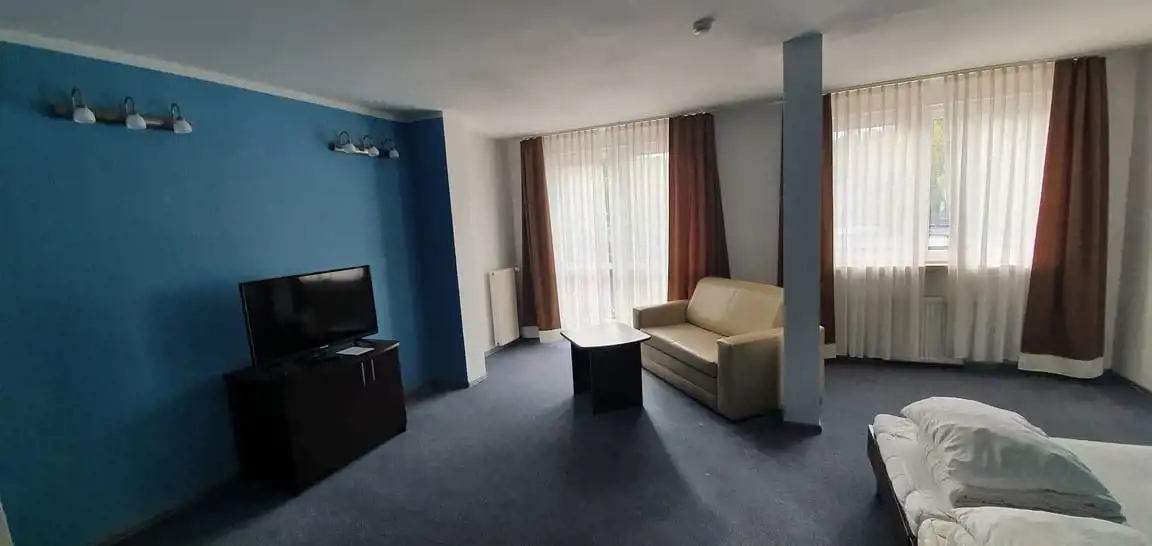 W pokoju dziennym znaleźć można zarówno komfortowo wydzieloną część sypialną (duże łóżko małżeńskie), jak i część wypoczynkową (sofa rozkładana dwuosobowa).