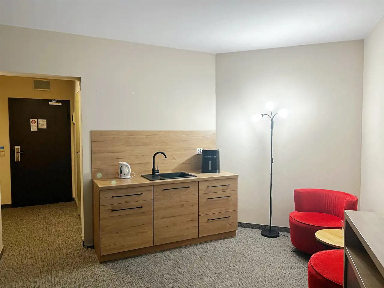 Wyposażony w standardzie hotelowym. Z dodatkowym aneksem kuchennym.
