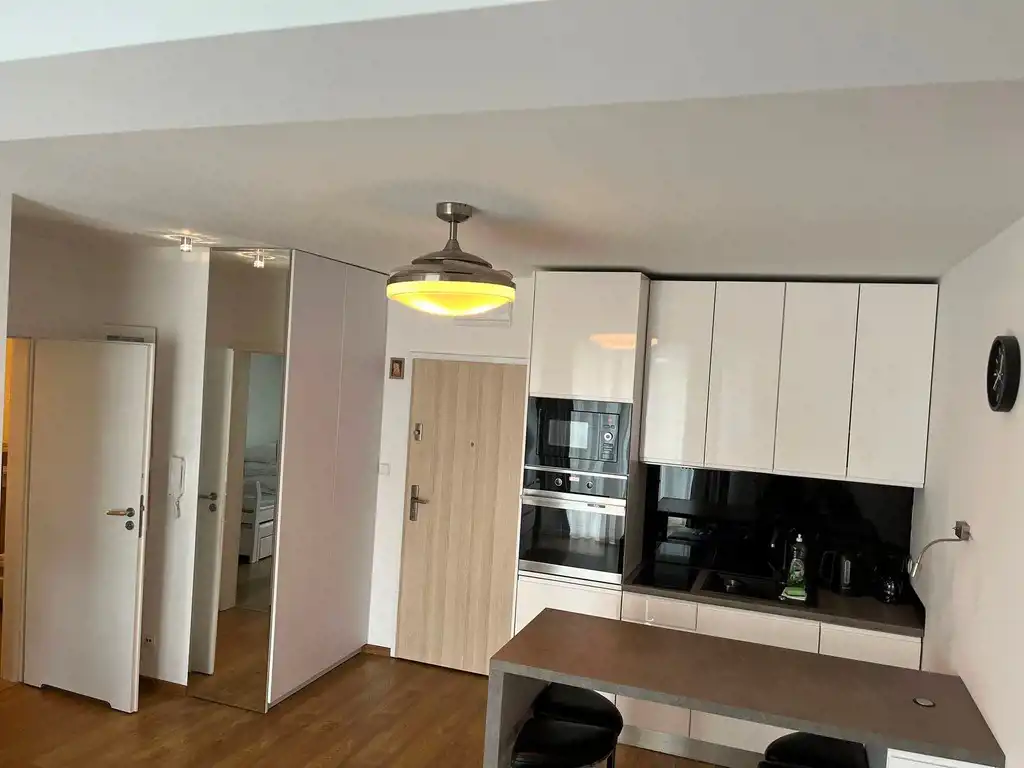 Apartament znajduje się na IV piętrze, dysponuje powierzchnią 35 m2 oraz balkonem, składa się z salonu z aneksem kuchennym, sypialni, łazienki z WC. Mieszkanie środkowe, ekspozycja okien zachodnia. W cenie sprzedaży wszystkie ruchomości z pełnym wyposażeniem do wynajmu. Meble kuchenne na wymiar z sprzętem AGD (płytą grzewczą indukcyjną, lodówką podblatową, piekarnikiem i mikrofalówką). Na podłogach panele, ściany w gładziach, wypłytkowana ładna, funkcjonalna łazienka z kabiną prysznicową i pralką. Wiele ogólnodostępnych miejsc parkingowych na terenie kompleksu. Do dyspozycji mieszkańców rowerownia w kondygnacji podziemnej budynku.