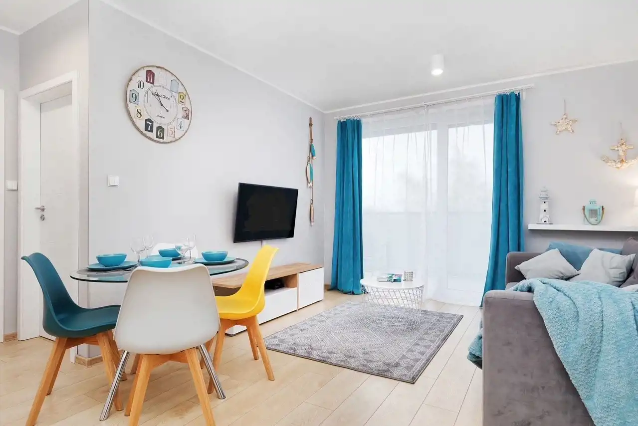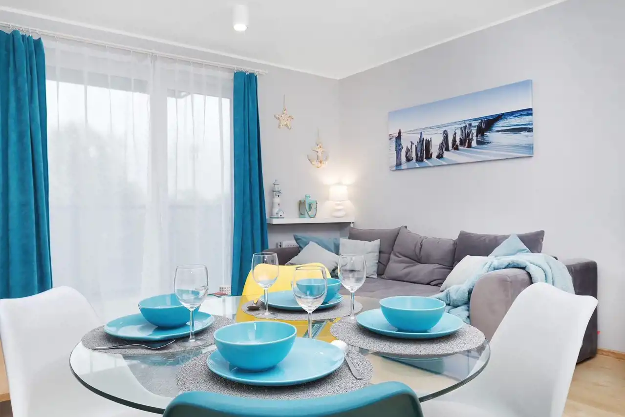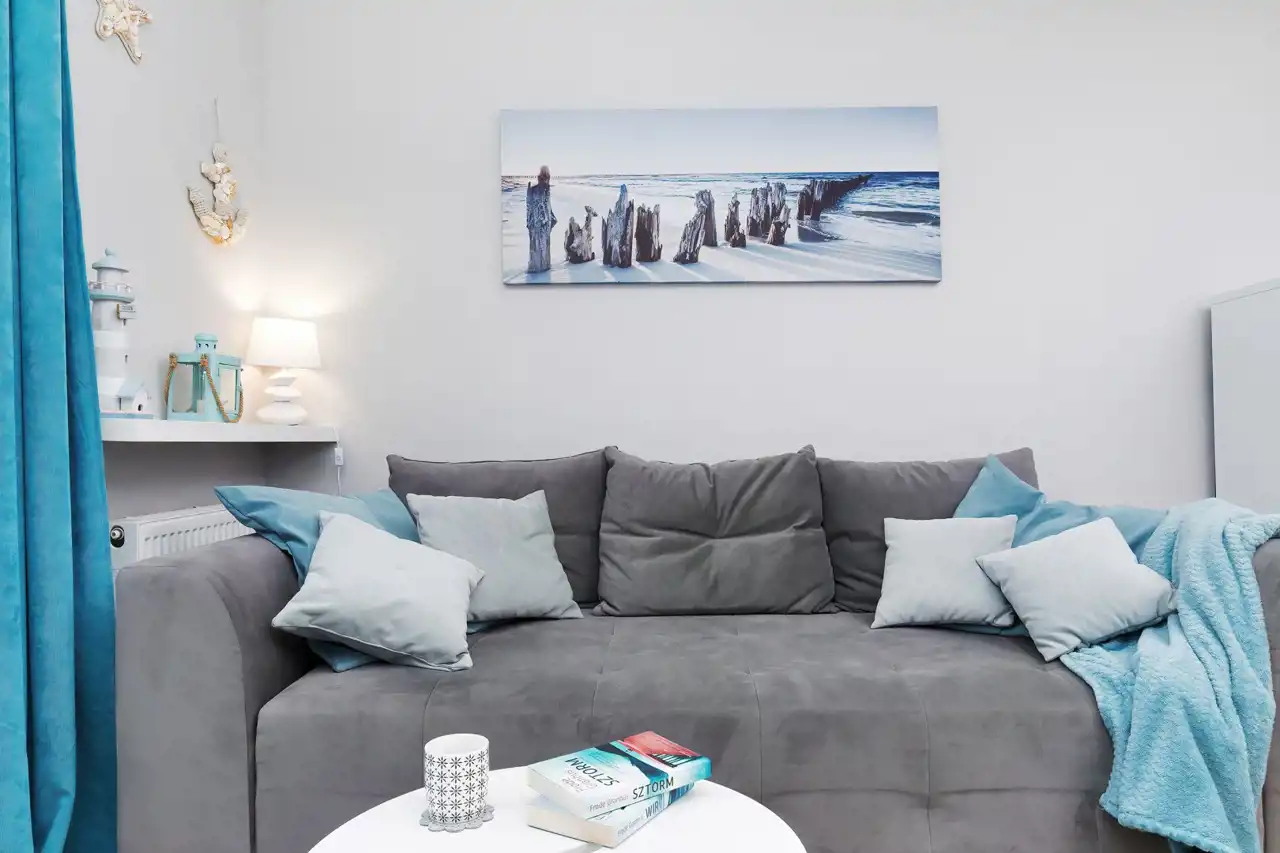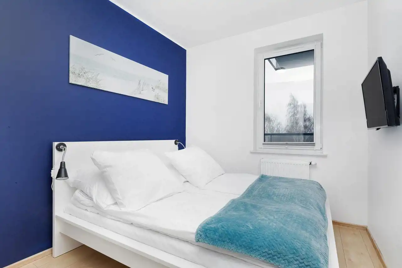 Sypialnia z wygodnym łóżkiem i szafą. Salon wyposażony jest w rozkładaną sofę, stolik kawowy, szafkę RTV oraz telewizor. Aneks kuchenny zawiera płytę indukcyjną, zmywarkę, lodówkę, ekspres do kawy, czajnik elektryczny, stół z krzesłami oraz pełne wyposażenie kuchenne (zastawa stołowa, sztućce, szklanki, kieliszki, garnki, patelnia).