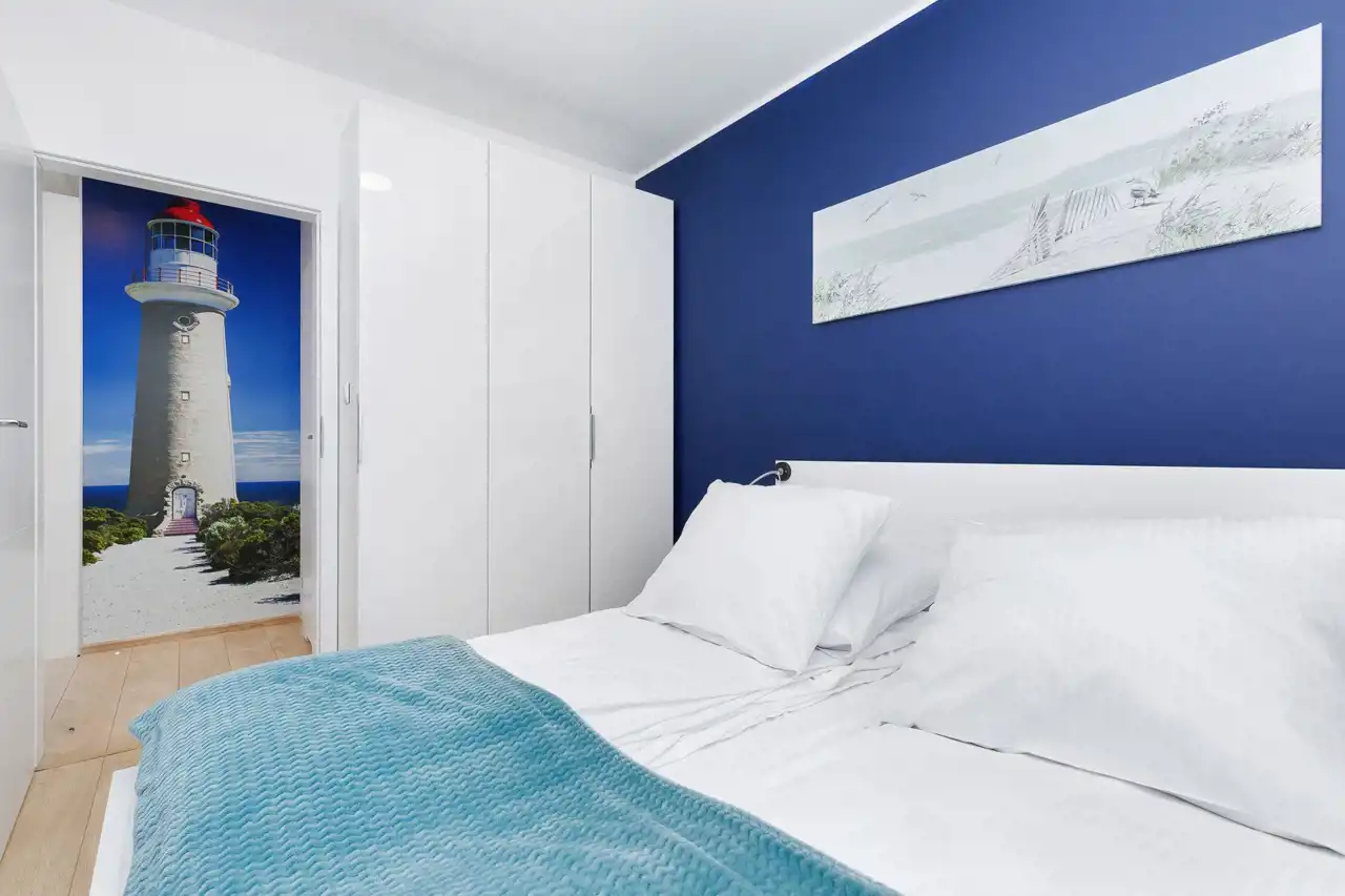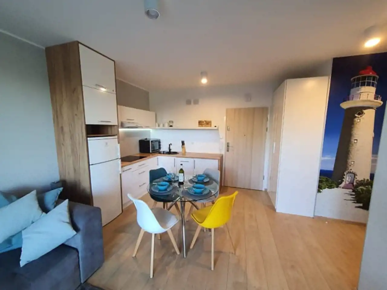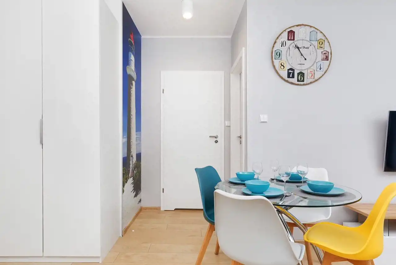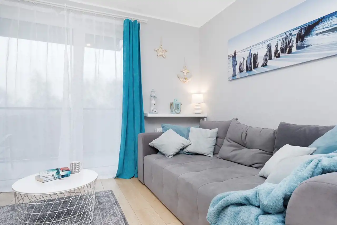 Sypialnia z wygodnym łóżkiem i szafą. Salon wyposażony jest w rozkładaną sofę, stolik kawowy, szafkę RTV oraz telewizor. Aneks kuchenny zawiera płytę indukcyjną, zmywarkę, lodówkę, ekspres do kawy, czajnik elektryczny, stół z krzesłami oraz pełne wyposażenie kuchenne (zastawa stołowa, sztućce, szklanki, kieliszki, garnki, patelnia).