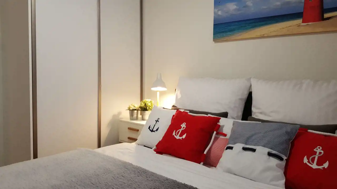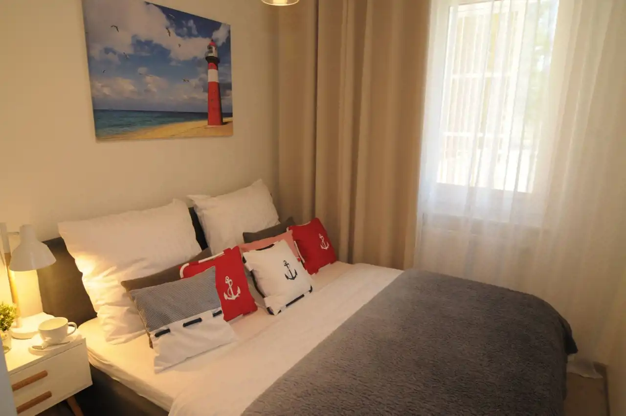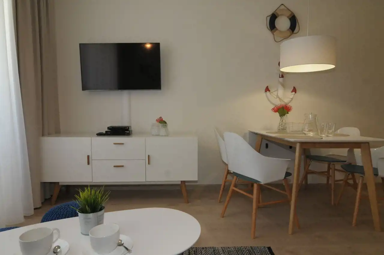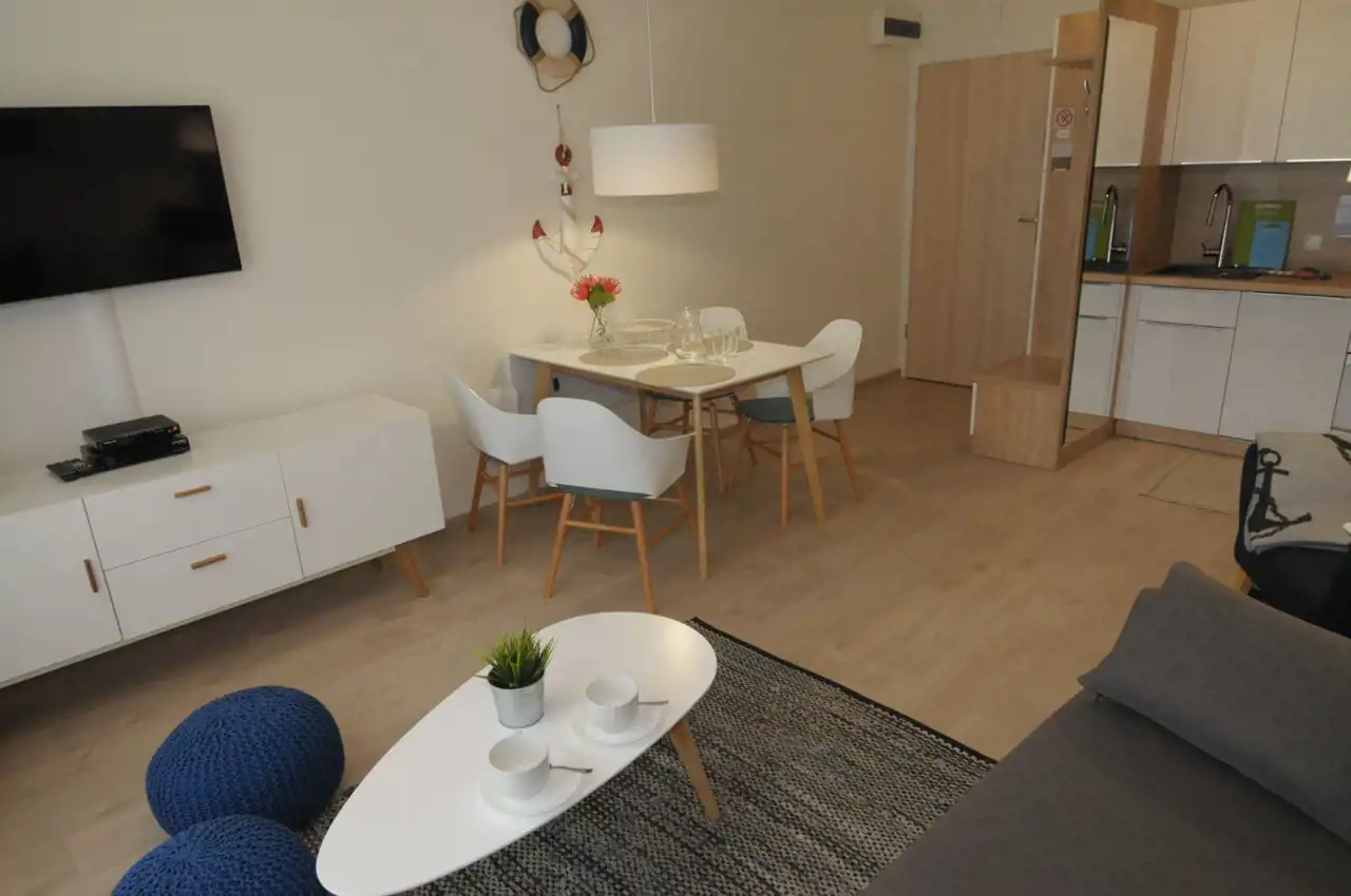 Sypialnia z wygodnym łóżkiem i szafą. Salon wyposażony jest w rozkładaną sofę, stolik kawowy, szafkę RTV oraz telewizor. Aneks kuchenny zawiera płytę indukcyjną, zmywarkę, lodówkę, ekspres do kawy, czajnik elektryczny, stół z krzesłami oraz pełne wyposażenie kuchenne (zastawa stołowa, sztućce, szklanki, kieliszki, garnki, patelnia).