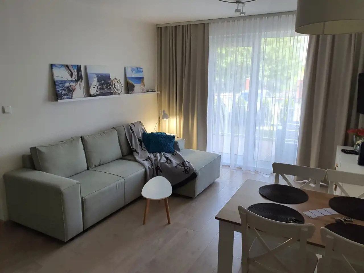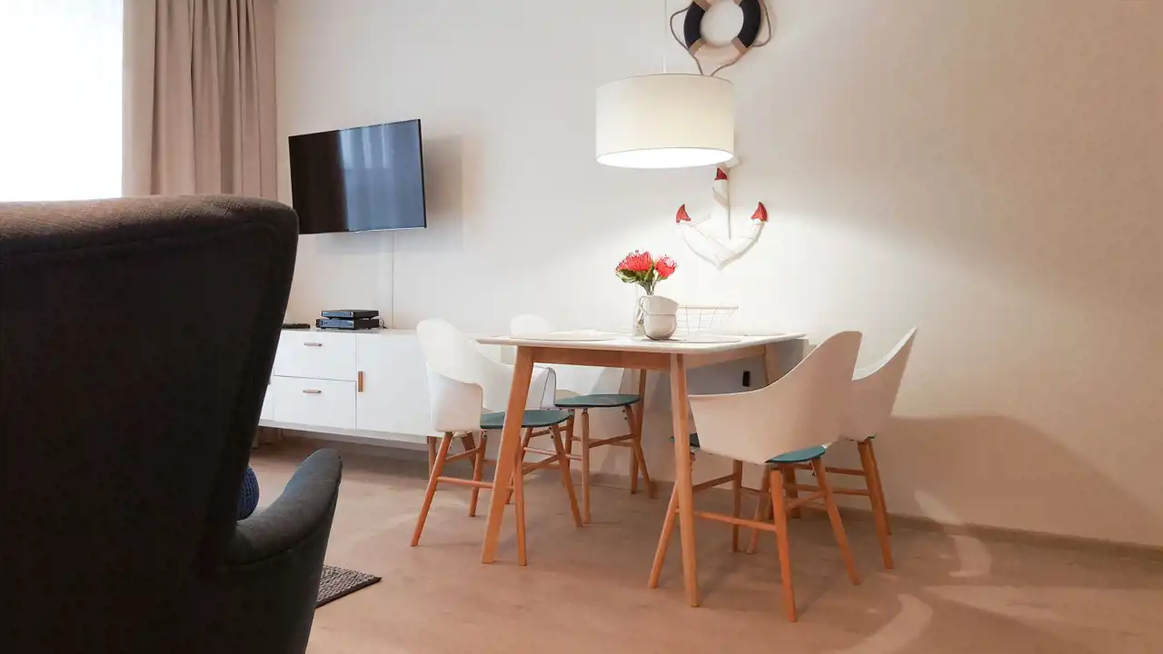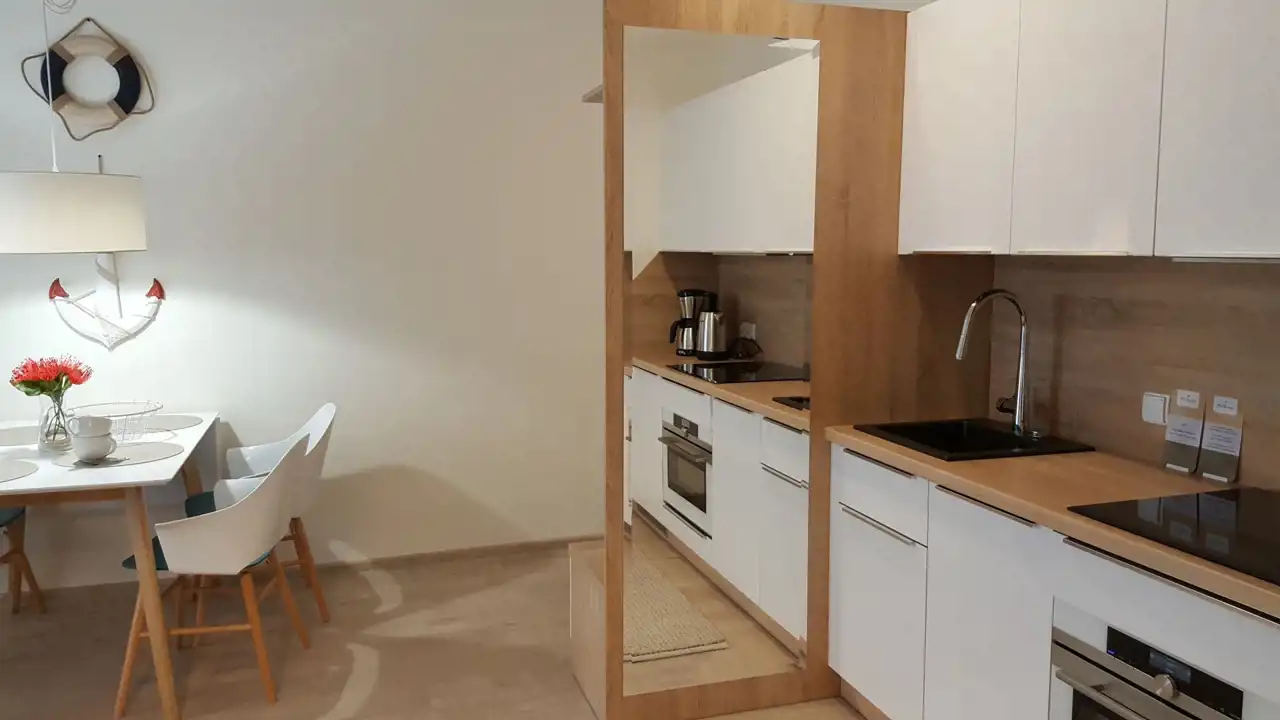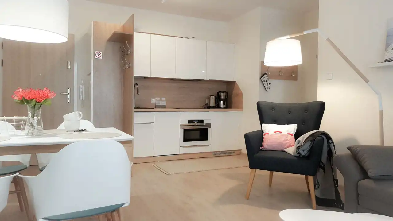 Sypialnia z wygodnym łóżkiem i szafą. Salon wyposażony jest w rozkładaną sofę, stolik kawowy, szafkę RTV oraz telewizor. Aneks kuchenny zawiera płytę indukcyjną, zmywarkę, lodówkę, ekspres do kawy, czajnik elektryczny, stół z krzesłami oraz pełne wyposażenie kuchenne (zastawa stołowa, sztućce, szklanki, kieliszki, garnki, patelnia).