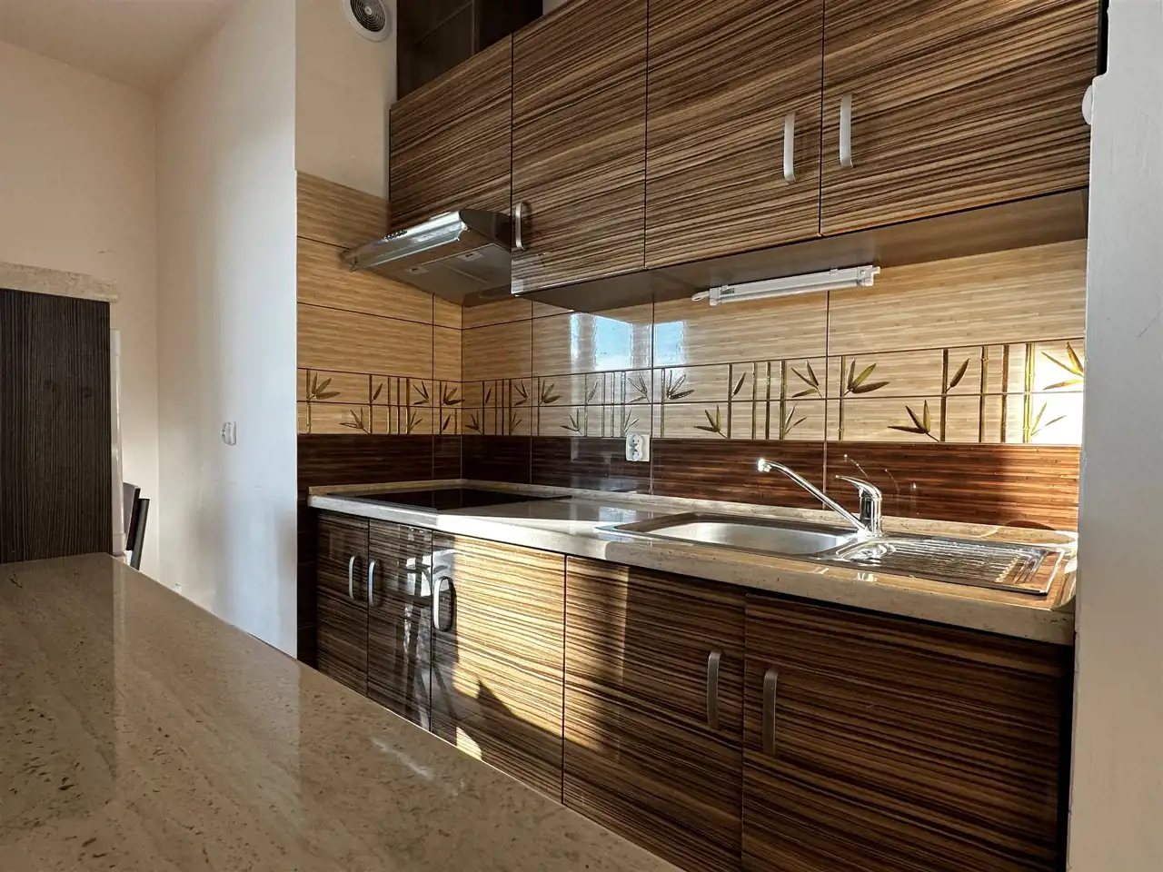Kuchnia z chłodziarko zamrażarką i płyta grzewczą, bez piekarnika.