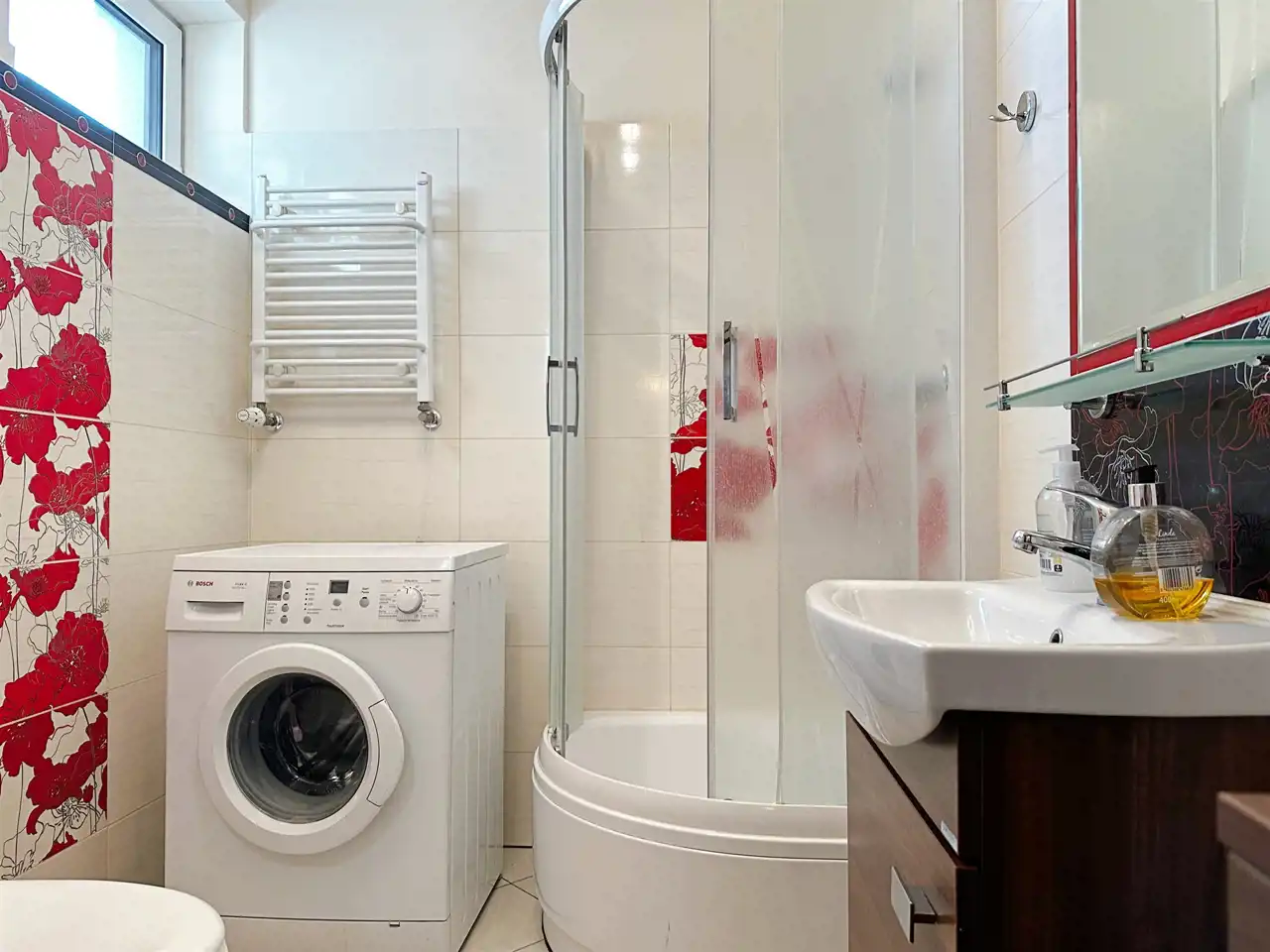 Łazienka z oknem i prysznicem wyposażona w pralkę.
