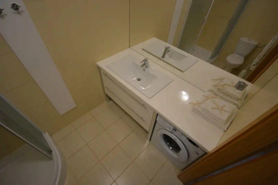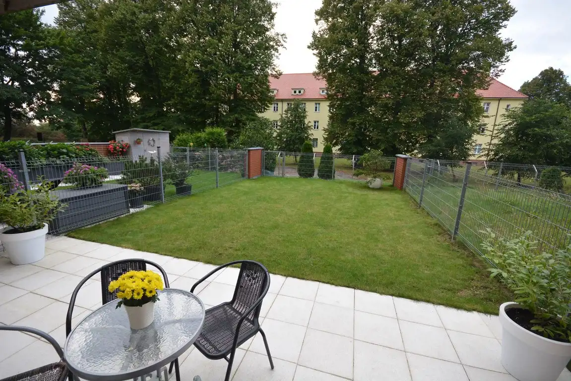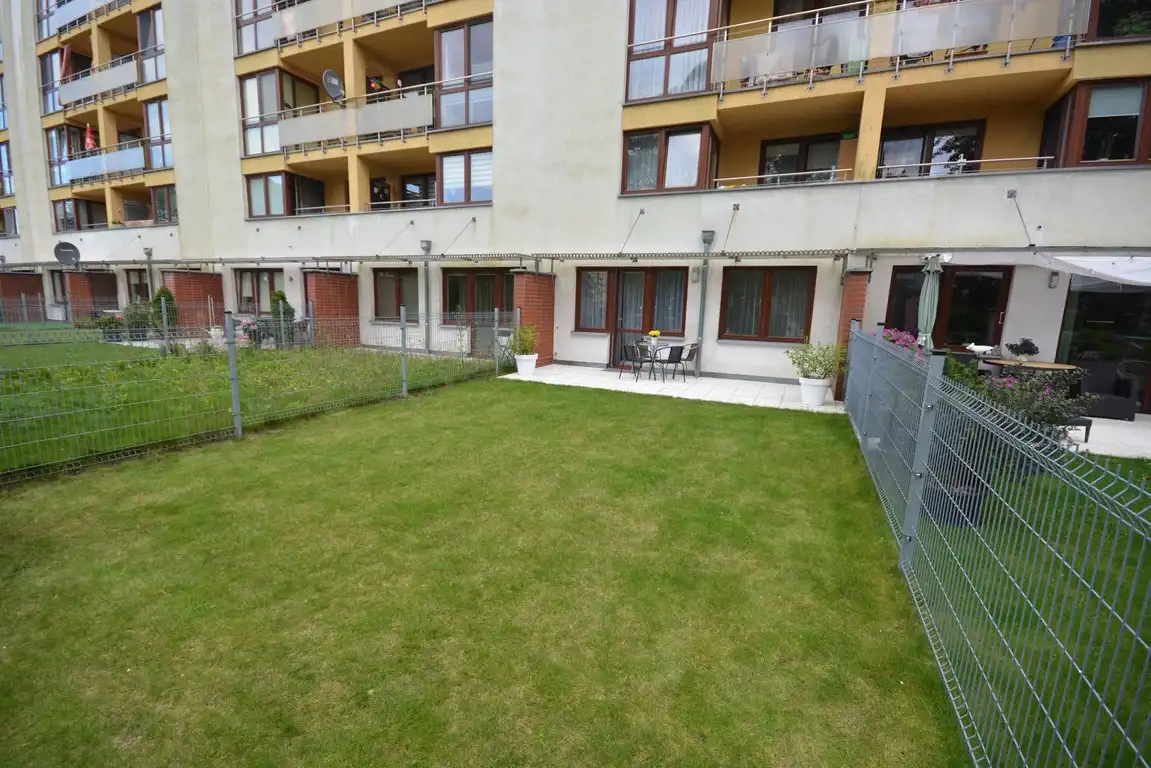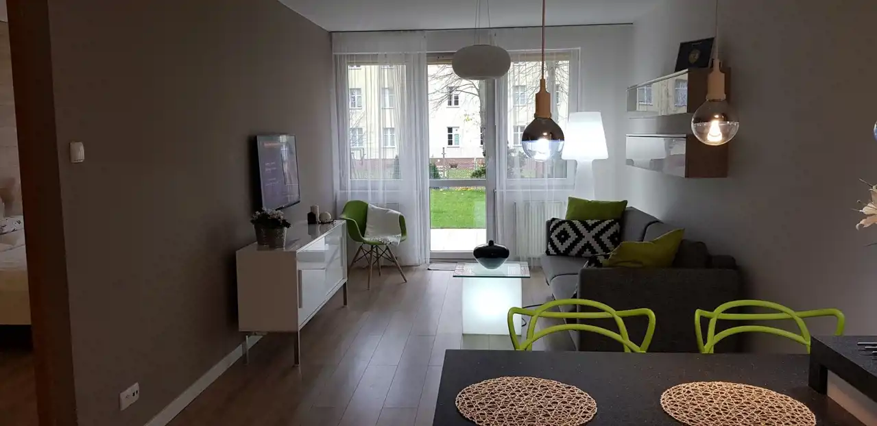 Apartament usytuowany jest na parterze nowoczesnego budynku z windą, na terenie ogrodzonego Osiedla Wiśniowy Sad, w bliskiej odległości od morza i piaszczystej, szerokiej plaży (spacerem 12 minut). Apartament składa się z pokoju dziennego z aneksem kuchennym, sypialni, przedpokoju, łazienki z WC (kabina prysznicowa, pralka Indesit). Posiada duży ogród o powierzchni około 65 m2. Ponadto do mieszkania przynależy garaż i komórka lokatorska.