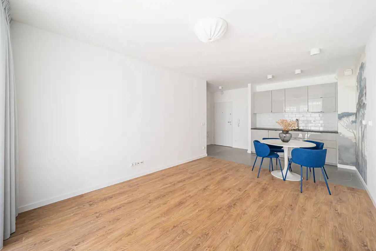 - przestronny salon z aneksem kuchennym oraz częścią jadalnianą wyposażoną w stół i krzesła o powierzchni 26,04m2