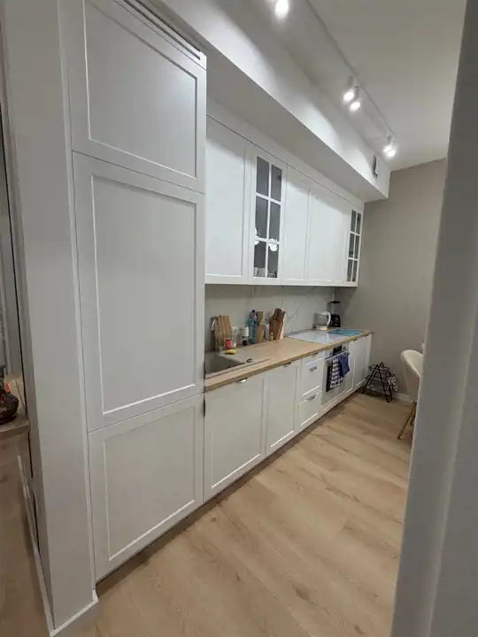 - kuchnia wykonana na wymiar, wyposażona w sprzęt AGD. W całym mieszkaniu liczne zabudowy stałe, które maksymalnie wykorzystują przestrzeń. Styl wnętrza – nowoczesny, jasny, ponadczasowy.
