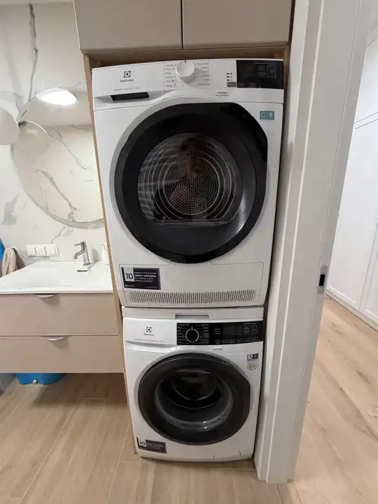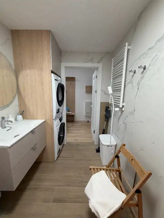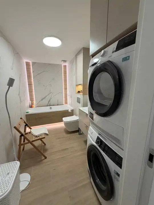 - nowoczesna łazienka z wanną, pralką i suszarką w zabudowie