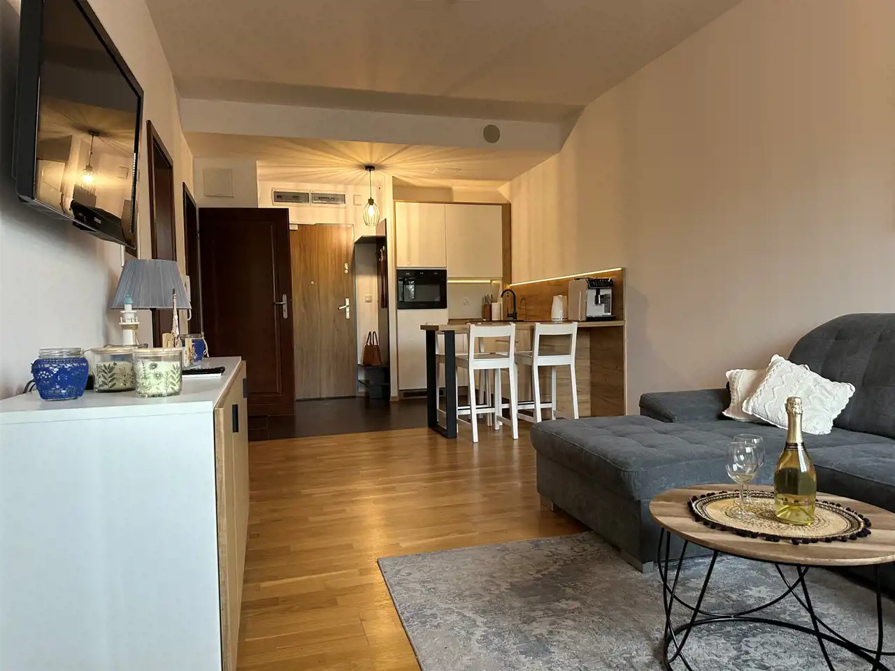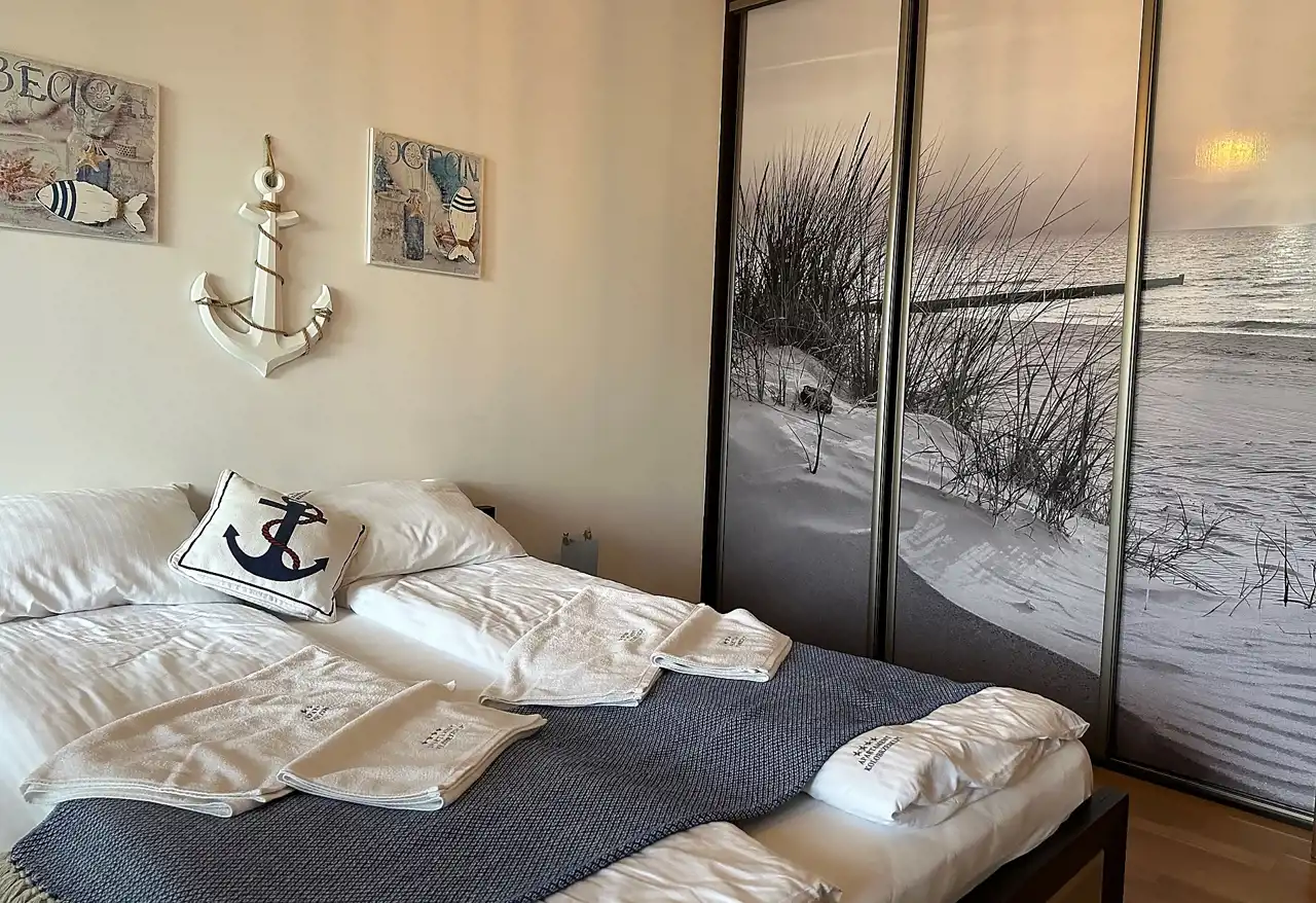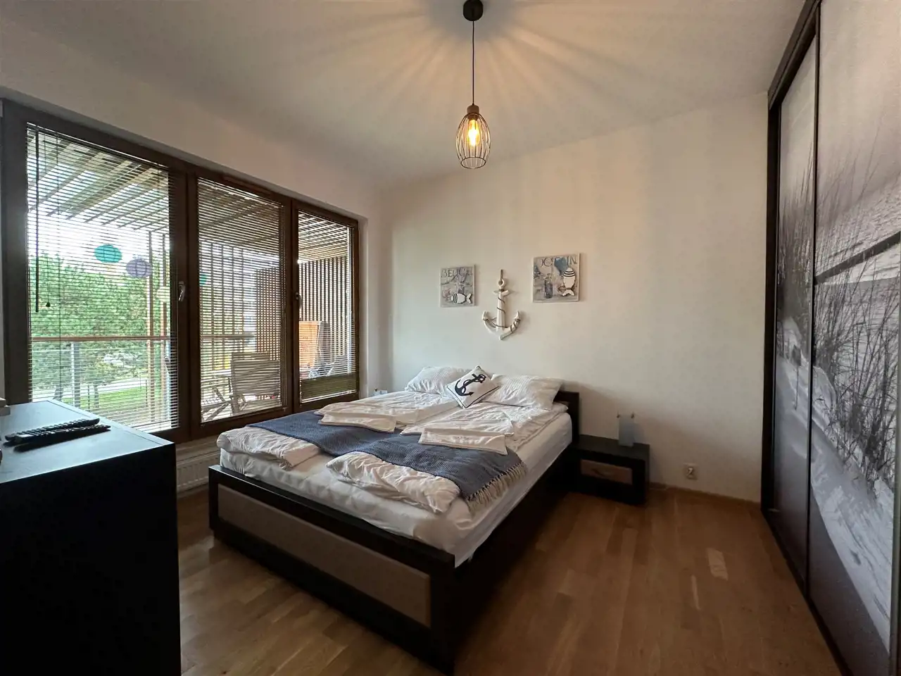 W pakiecie z wyposażeniem, umeblowany: w sypialni wygodne łóżko, komoda i pojemna szafa w zabudowie na całej ścianie,