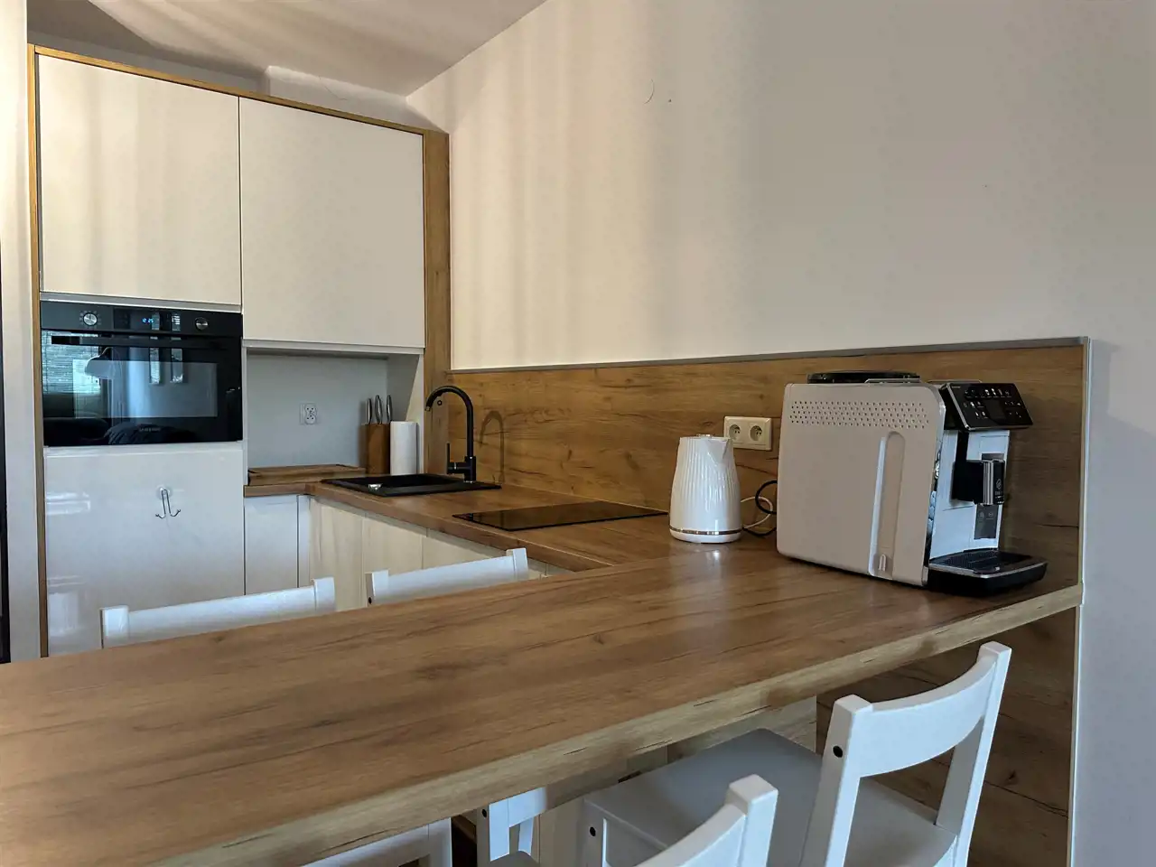 oraz aneks kuchenny, wyposażony w sprzęt agd w ładnej zabudowie z miejscem do jedzenia.