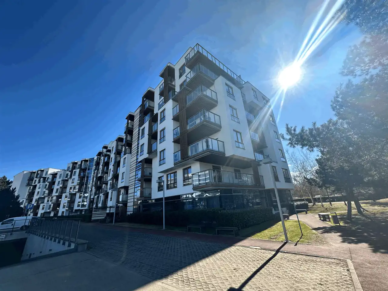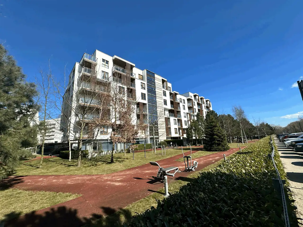 w budynku z 3 windami i zewnętrznym fitnessem oraz tartanową ścieżką do joggingu.