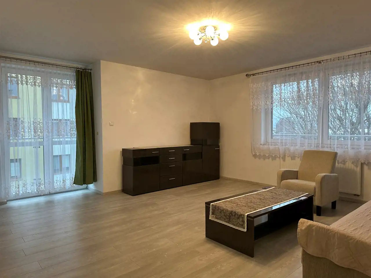 Meble w pokoju: szafki, ława, rozkładana sofa oraz fotel.