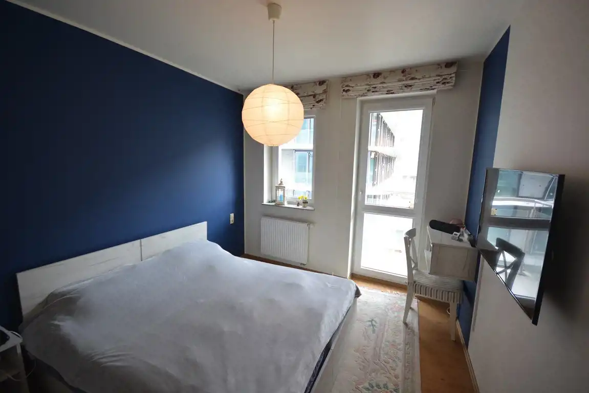 Apartament dysponuje powierzchnią 50,76 m2 oraz dużym balkonem (14,44 m2) na który wyjdziemy zarówno z pokoju dziennego jak i sypialni. Składa się z: