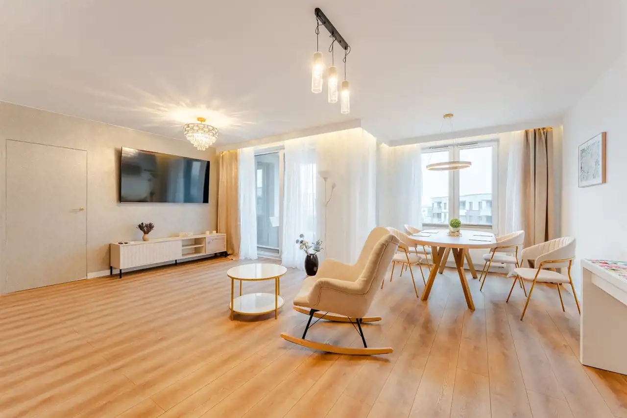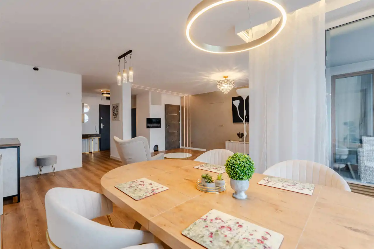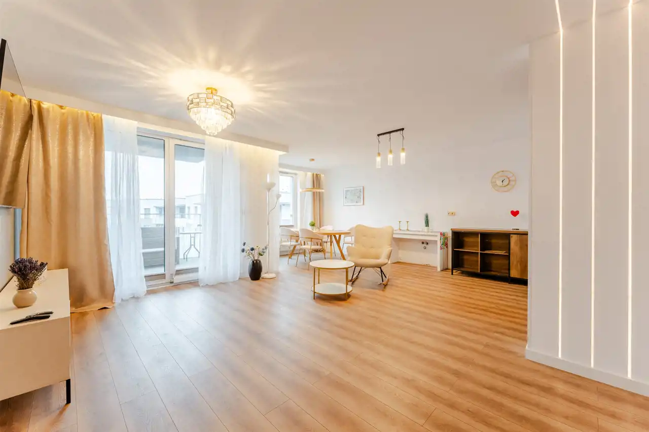 Salon z aneksem kuchennym - jasna przestrzeń z wyjściem na balkon, eleganckie oświetlenie, spójna kolorystyka.