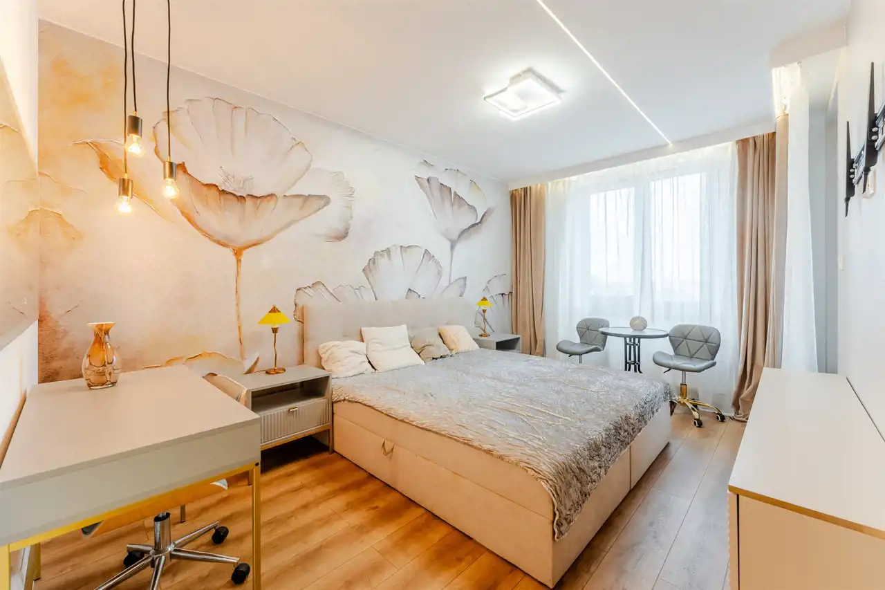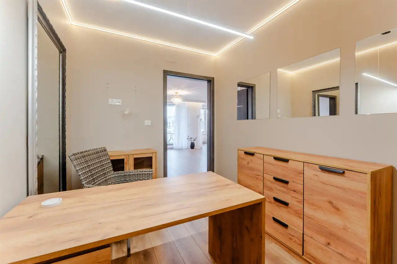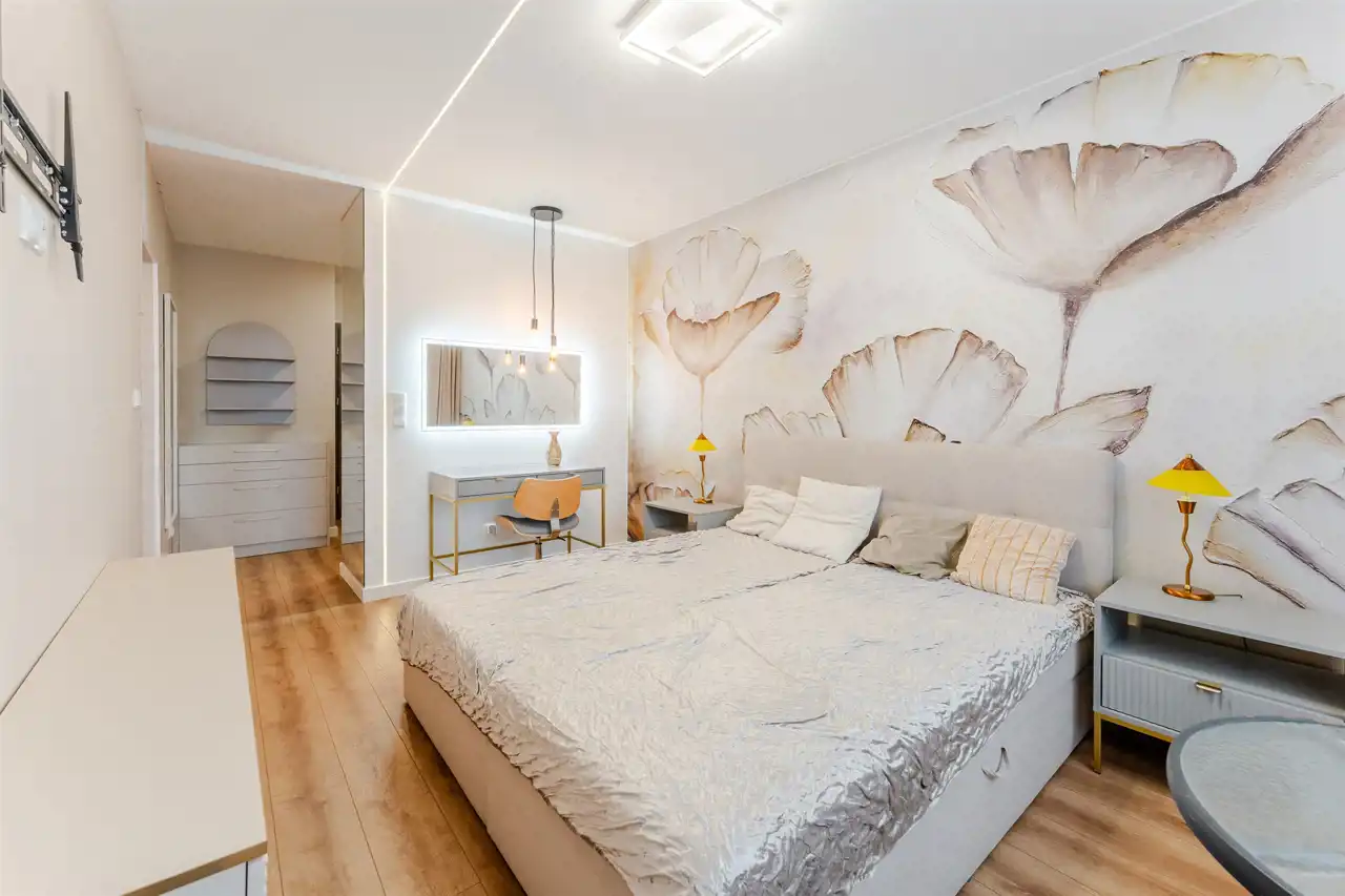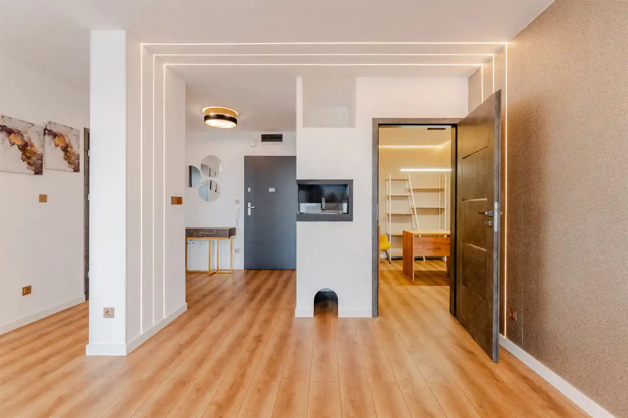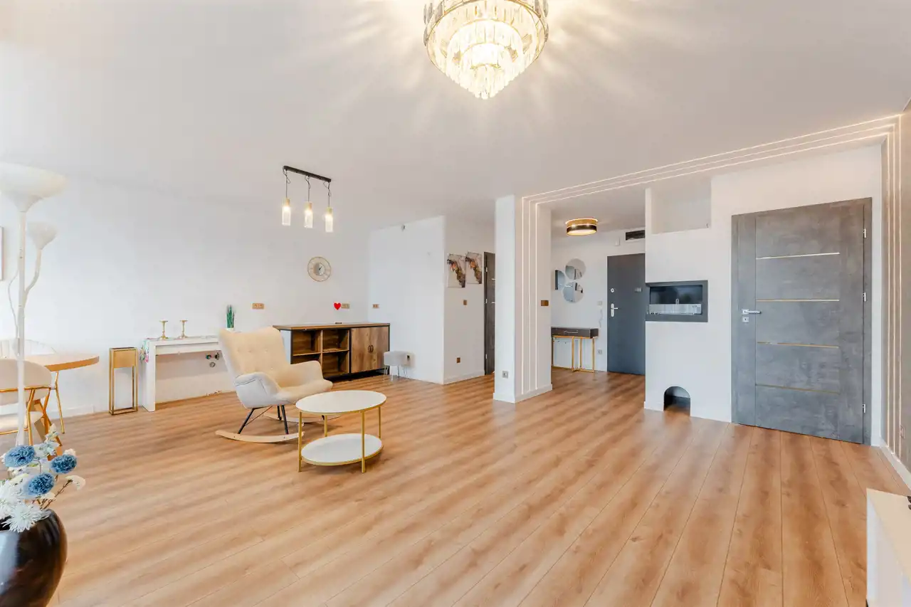 Na sprzedaż elegancki apartament w nowoczesnym budynku z windą, położony na ostatnim piętrze. Nieruchomość wykończona w spójnym, designerskim stylu. Złote detale, drewno, wielkoformatowe płytki, nastrojowe oświetlenie LED. To wnętrze robi efekt „wow” od pierwszego kroku.