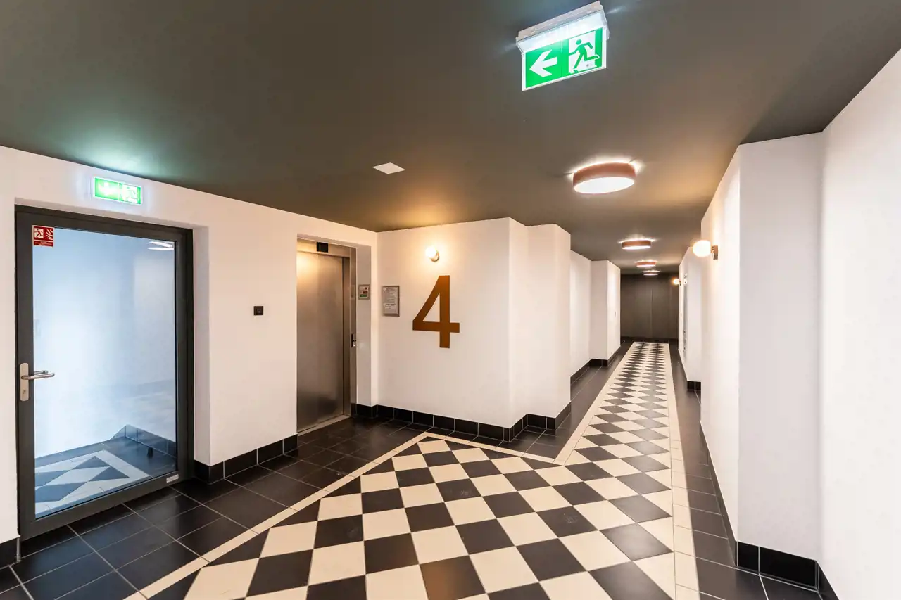 Nowoczesna inwestycja z 2023 roku - niska zabudowa, eleganckie części wspólne, winda, estetyczne klatki schodowe.