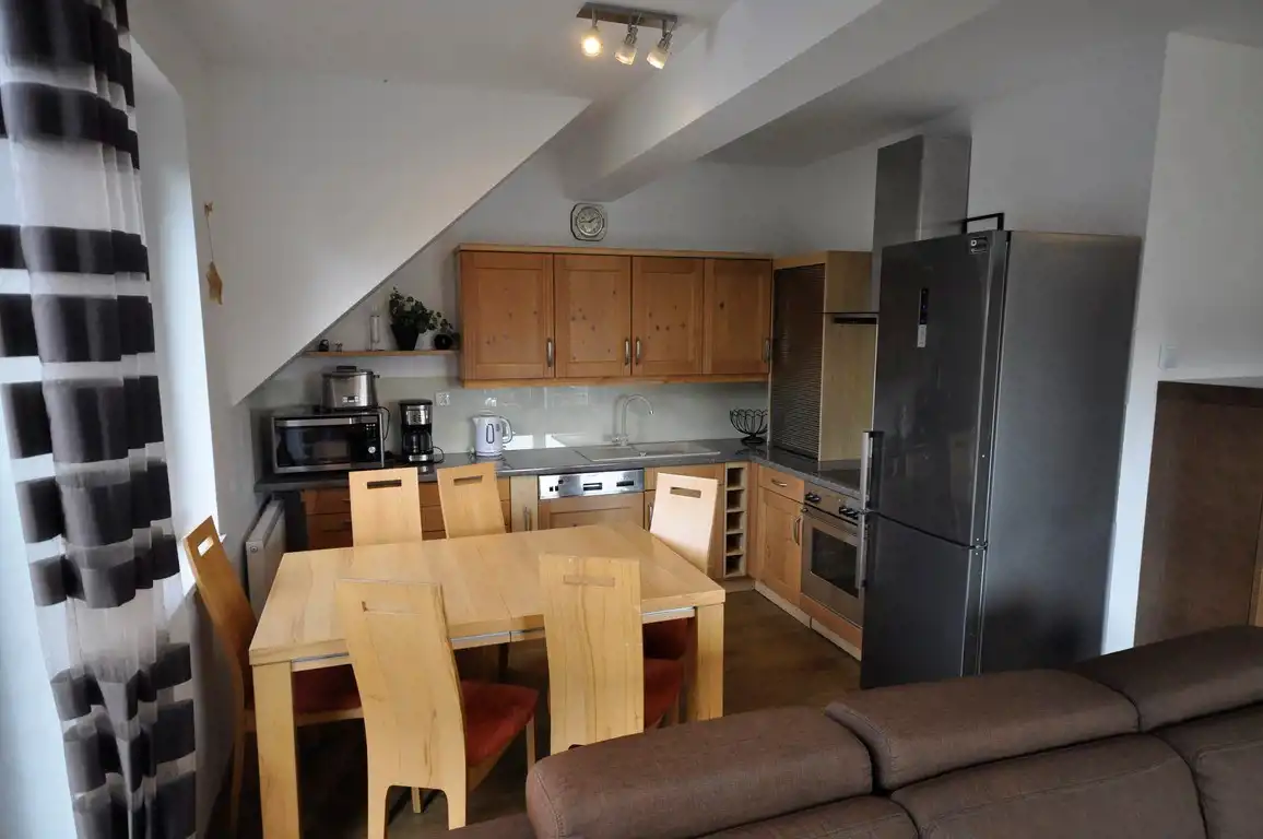 - salon z aneksem kuchennym wyposażonym w zmywarkę, piekarnik i płytę grzewczą firmy EFF oraz nową