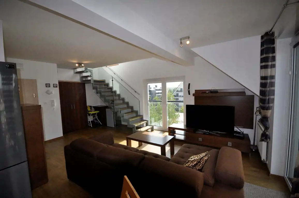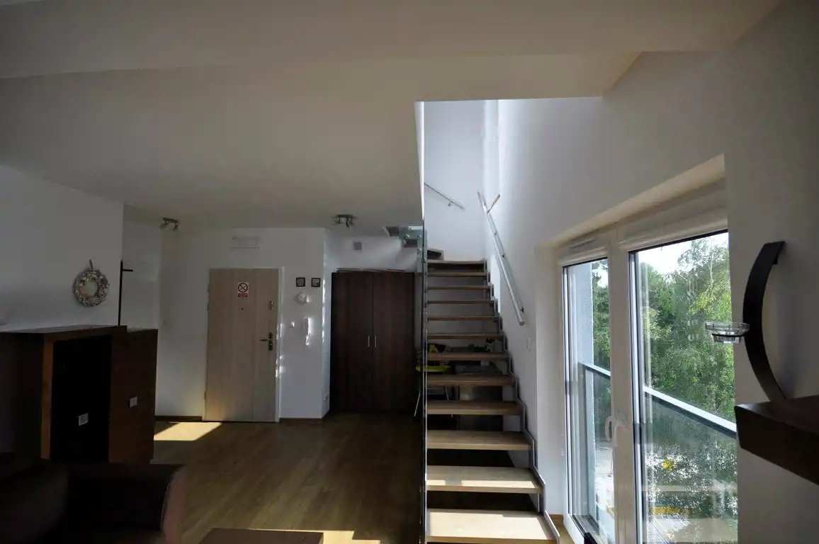 Dwupoziomowy apartament znajduje się na IV piętrze, dysponuje powierzchnią użytkową 71 m2, balkonem i tarasem oraz garażem (17,5 m2) w hali podziemnej zamykanym elektryczną roletą.