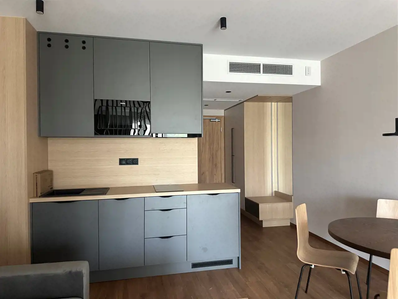 Salon z aneksem kuchennym wyposażony w sprzęt AGD ze zmywarką i mikrofalówką,