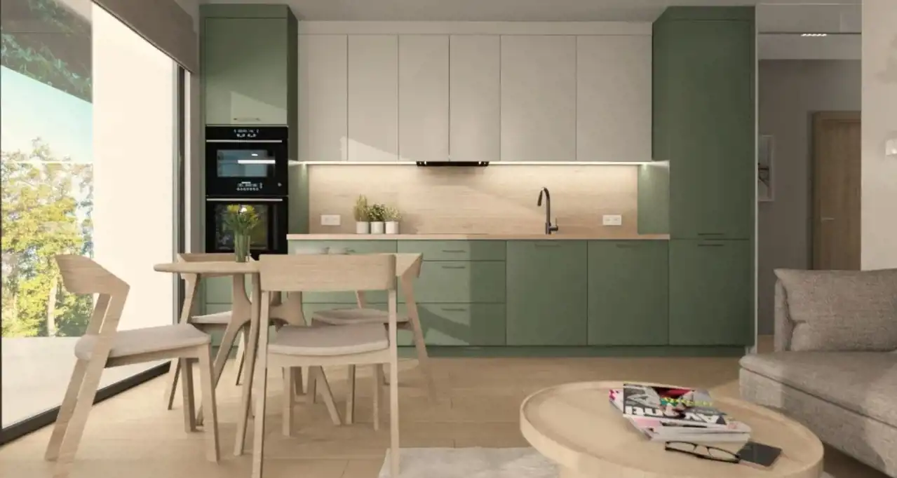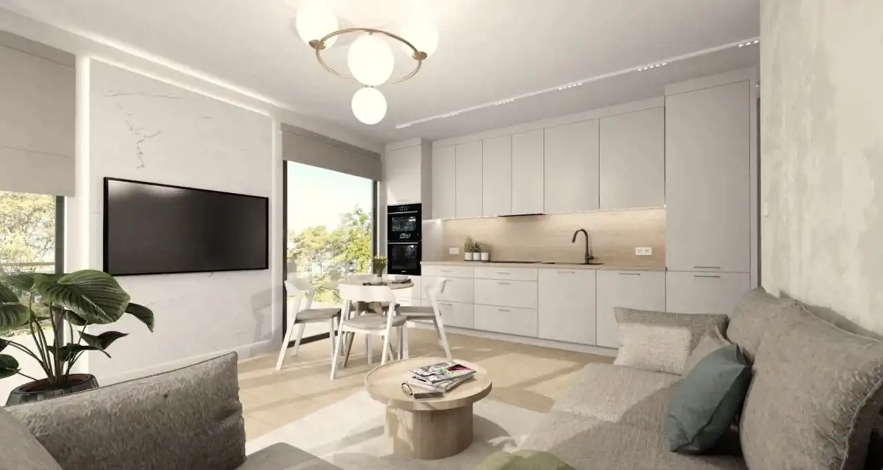 - Duży salon z przestronnymi oknami, które zapewniają doskonałe naturalne doświetlenie, połączony z funkcjonalną kuchnią.