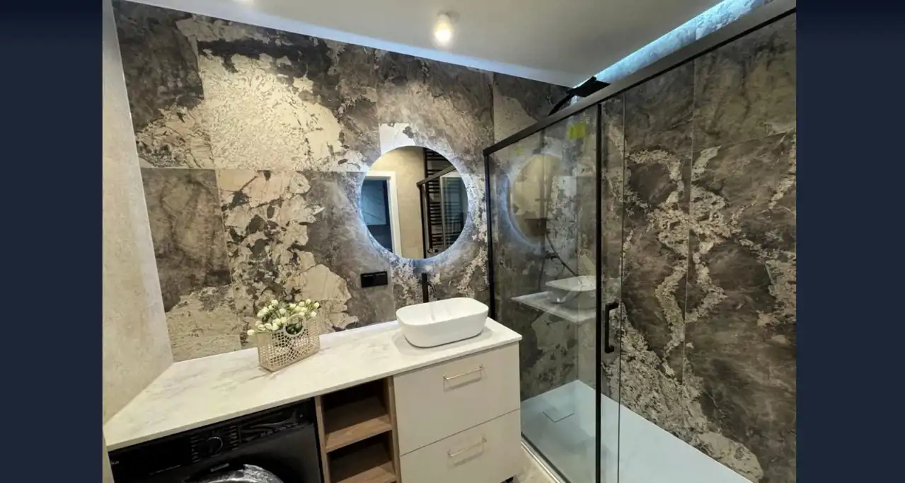 - Łazienka, w której zastosowano wysokiej jakości płytki o unikalnym designie – jest już w pełni wykończona (zdjęcia w załączniku gotowej łazienki wykończonym w proponowanym stylu).