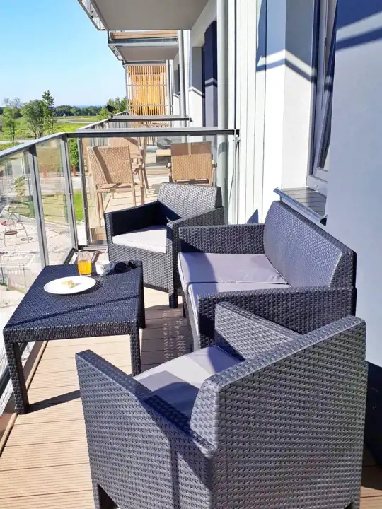 Duży balkon z widokiem na morze. Rowerownia w budynku.