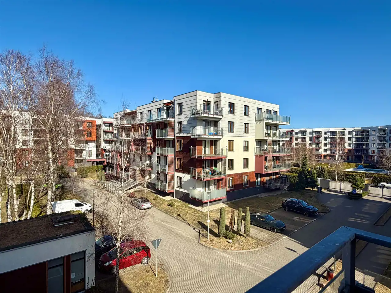 Usytuowany na 3 piętrze budynku. Teren zamknięty, brama wjazdowa na pilota, wokół budynku ogólnodostępne miejsca postojowe.