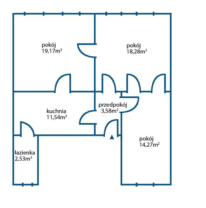 W skład lokalu wchodzą 3 pokoje (19,17 m², 18,28 m² i 14,27 m²), kuchnia (11,54 m²), łazienka (2,53 m²) i przedpokój (3,58 m²).