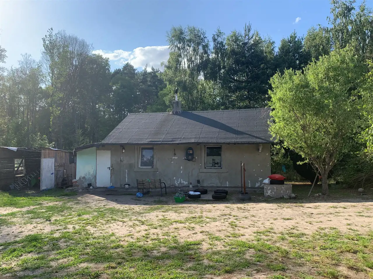 Działka ok. 3800 m kw. zabudowana całorocznym domem mieszkalnym przeznaczonym do kapitalnego remontu, bądź wyburzenia. Dom ma powierzchnię ok.45 m kw, 4 małe pokoje, mała kuchnia i łazienka. Na działce postawiony jest domek holenderski starego typu oraz dwie szopki. Działka wokół domu jest ogrodzona.
