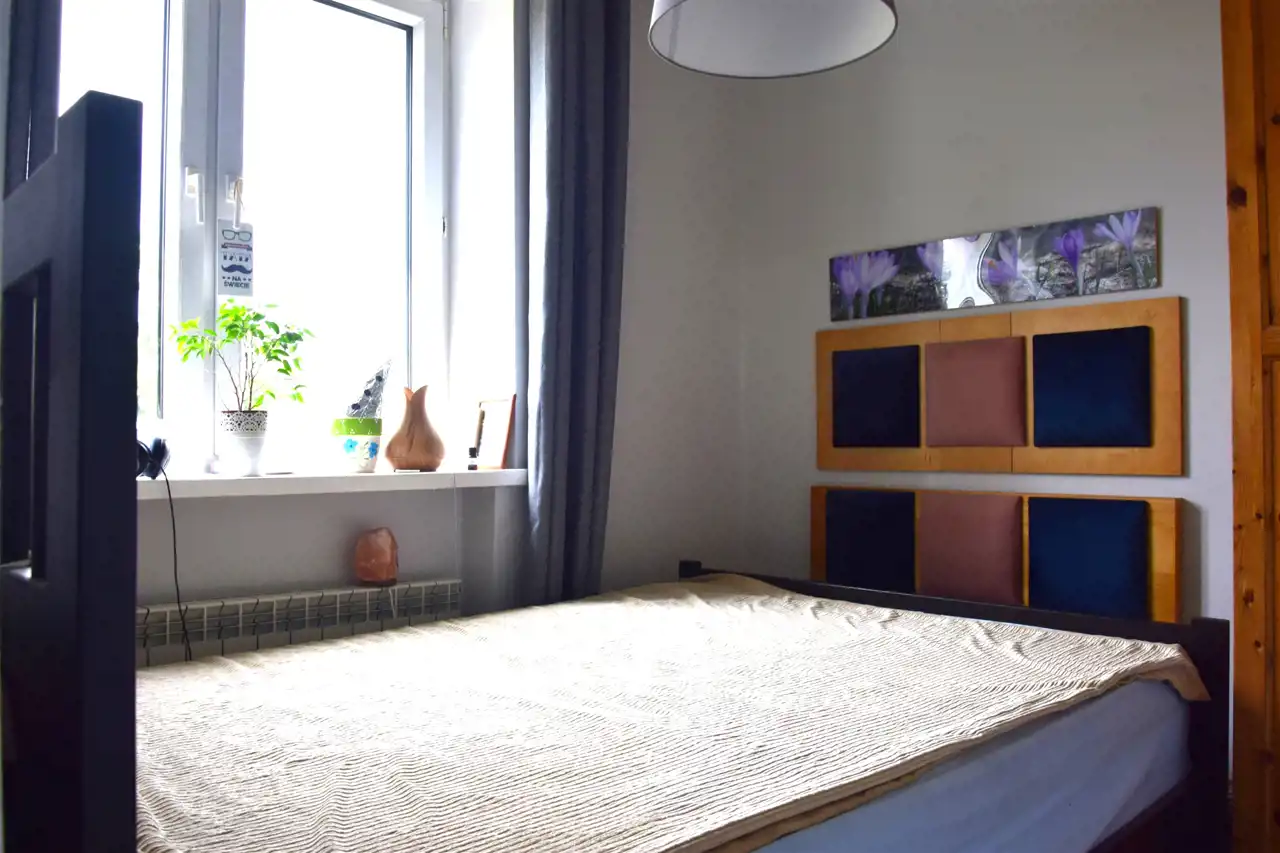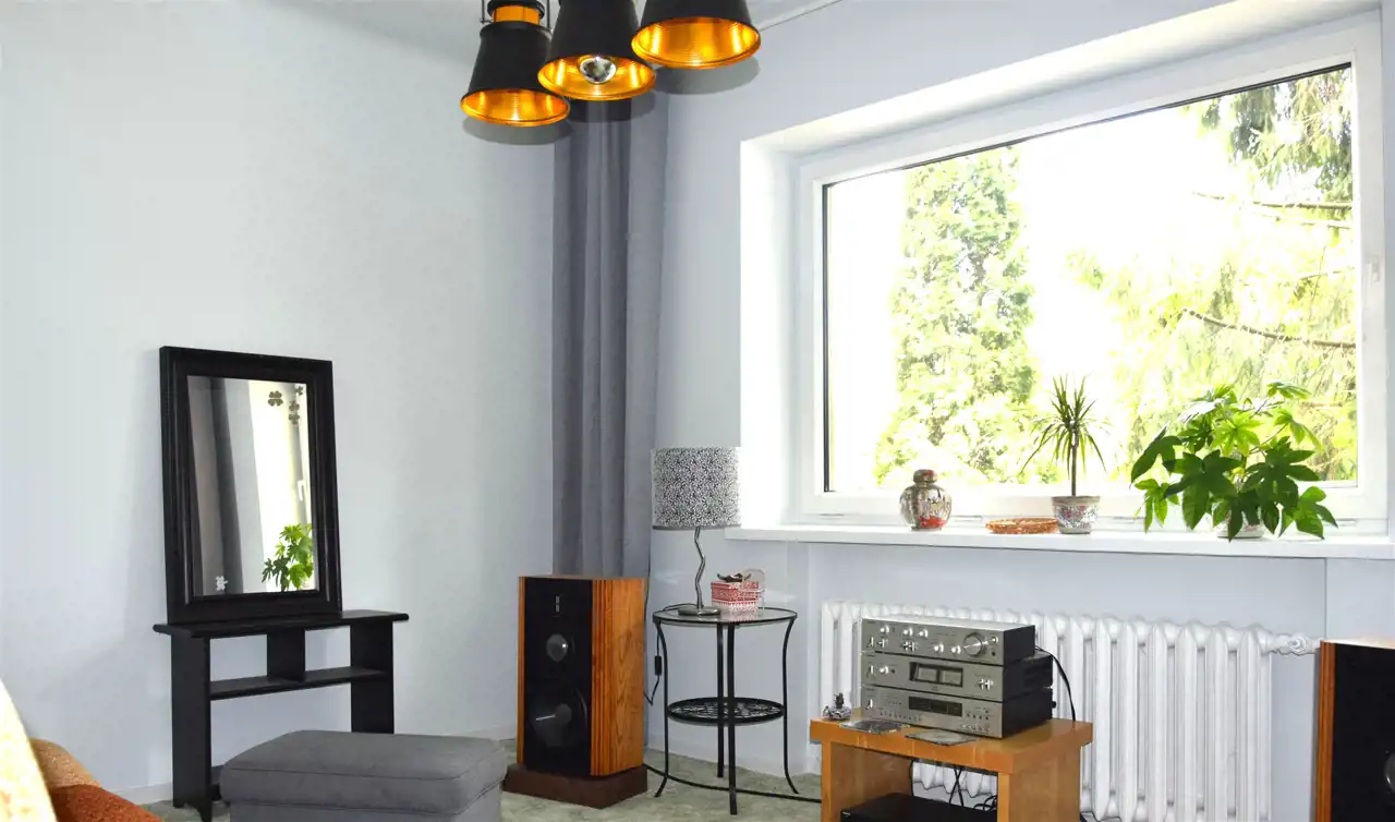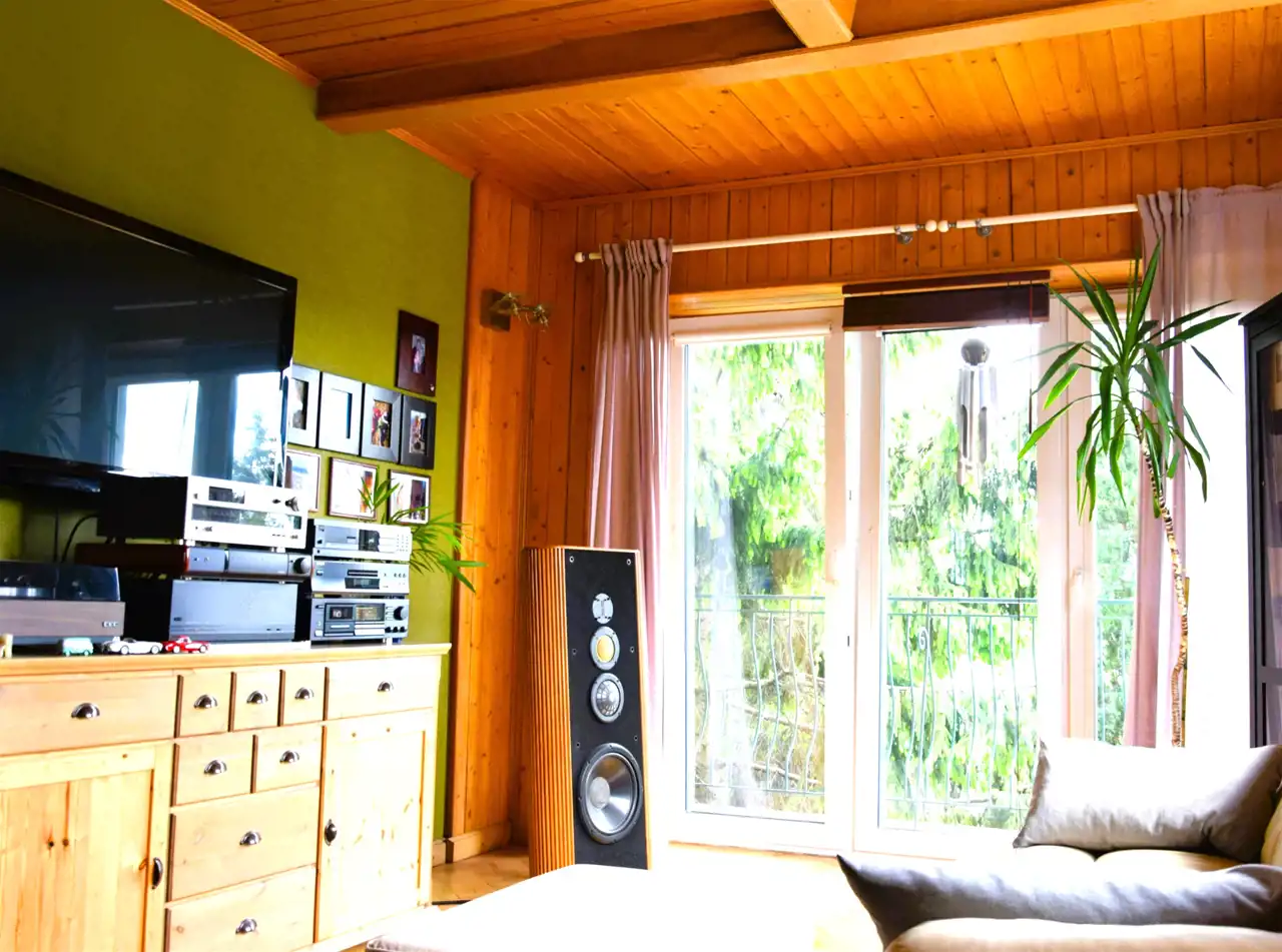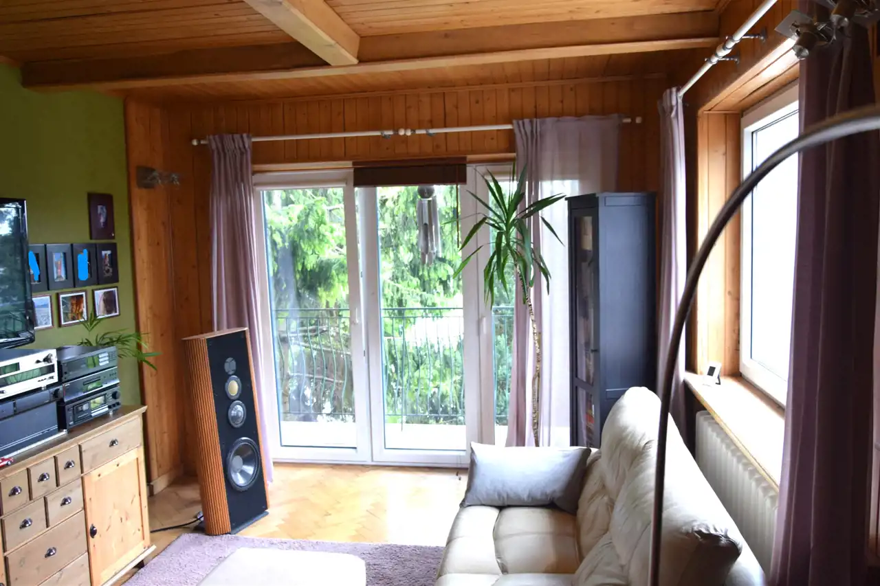 - komfortowy salon łączony drzwiami z drewna z wyjściem na balkon