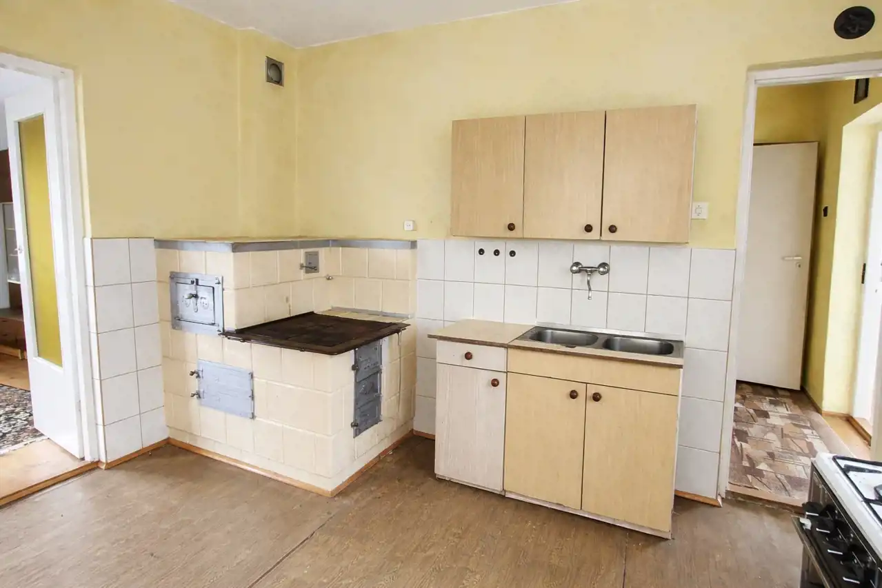 Murowany podpiwniczony dom do remontu kryty blachą w spokojnej okolicy. Kuchnia, łazienka, korytarz, ganek, 3 pokoje. Możliwa adaptacja poddasza na cele mieszkaniowe. Dwie duże działki do zagospodarowania według własnego pomysłu, murowano drewniany budynek gospodarczy służący jako garaż.