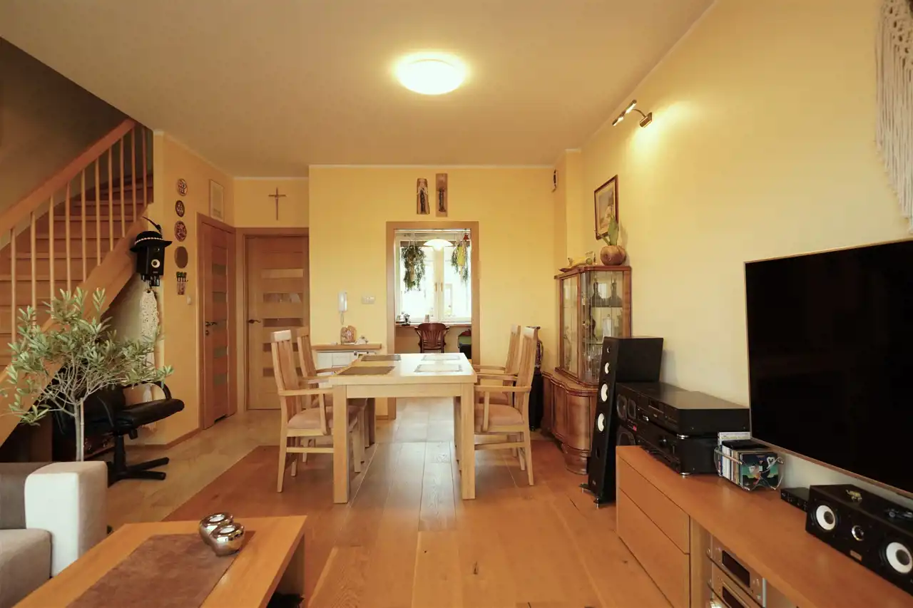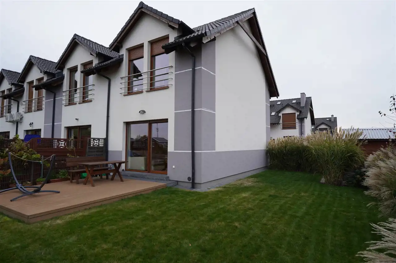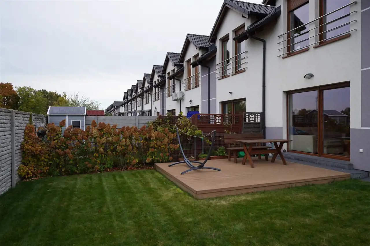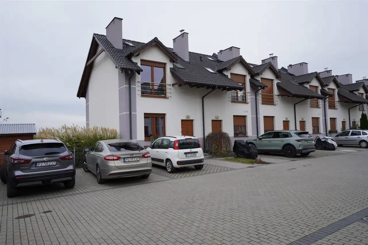 Skrajny segment szeregowca o powierzchni 72,93 m2, znajdujący się przy ul. Szkolnej na zamkniętym osiedlu w Plewiskach.