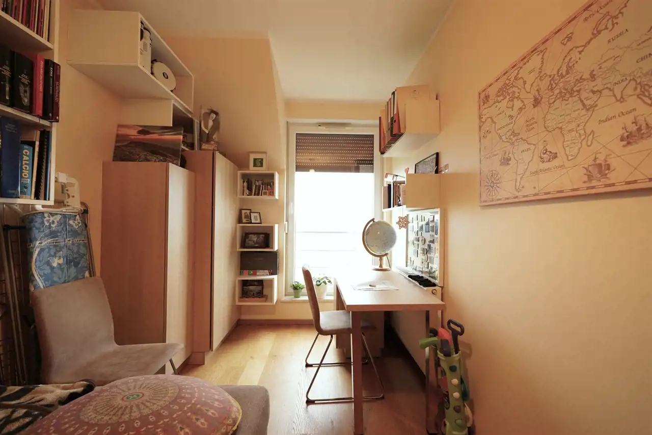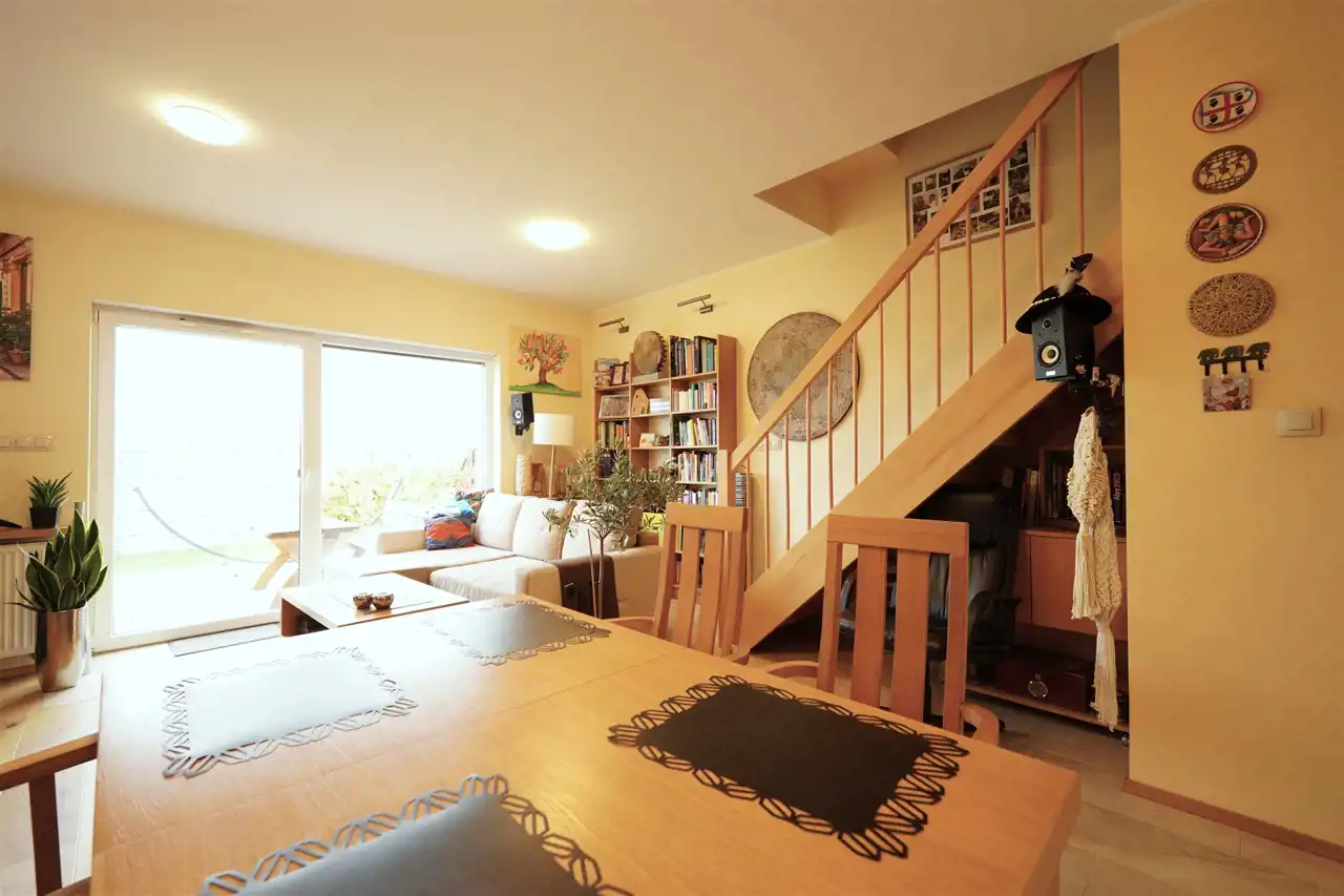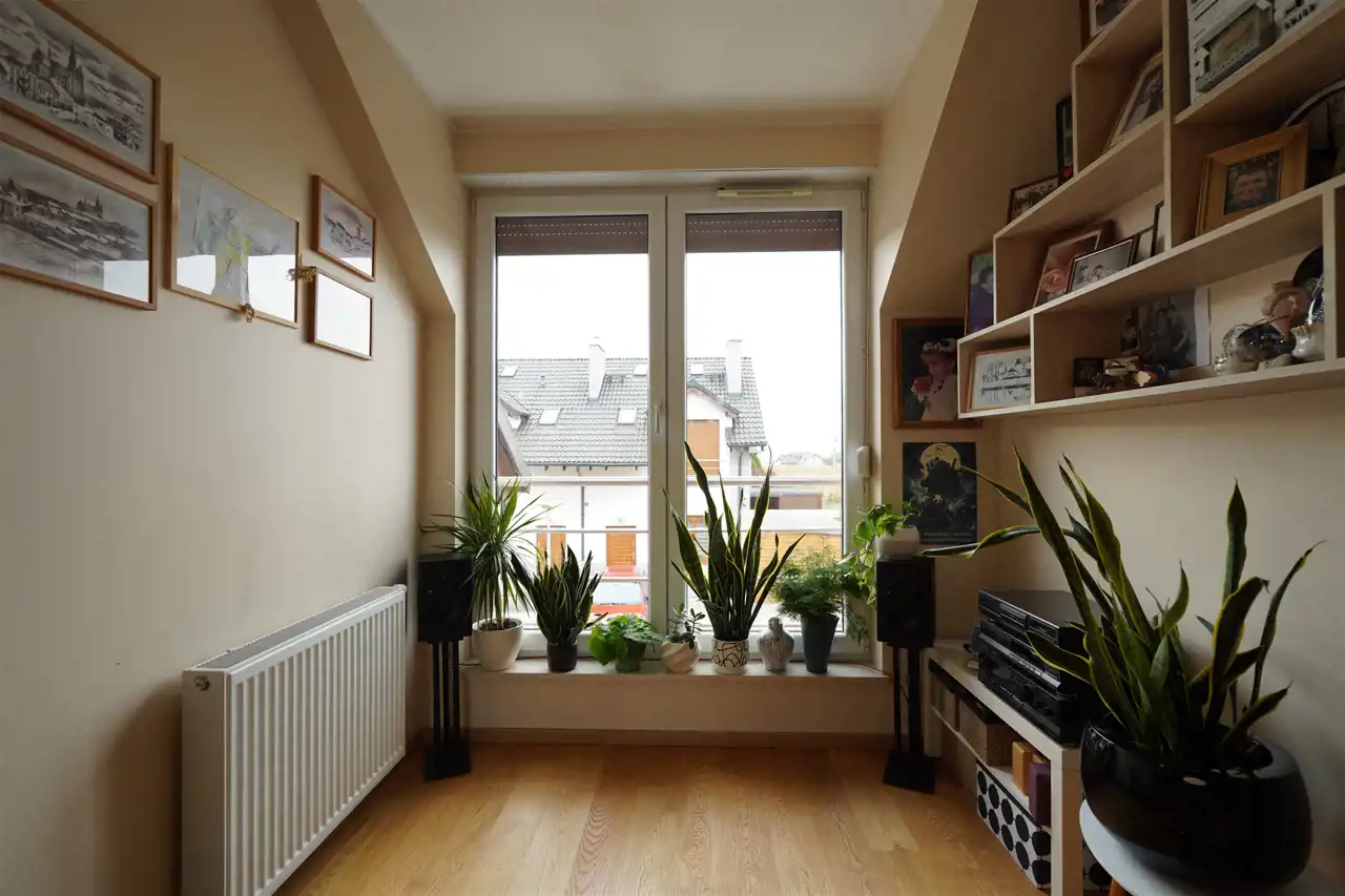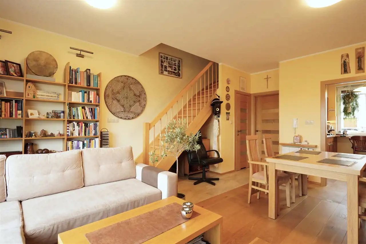 Skrajny segment szeregowca o powierzchni 72,93 m2, znajdujący się przy ul. Szkolnej na zamkniętym osiedlu w Plewiskach.