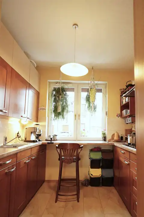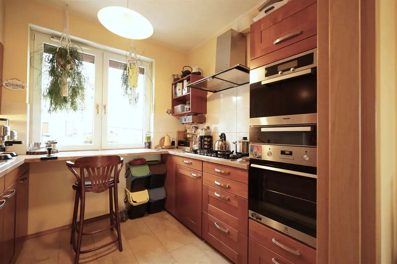 Kuchnia zabudowana szafkami na wymiar wyposażona w sprzęt AGD bardzo dobrej klasy(okap, płyta gazowa, zmywarka, piekarnik elektryczny, lodówka).