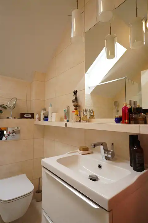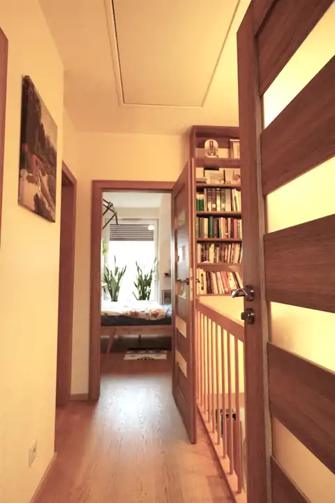 Na podłogach w salonie korytarzy i sypialniach deska barlinecka, w kuchni i łazienkach płytki.