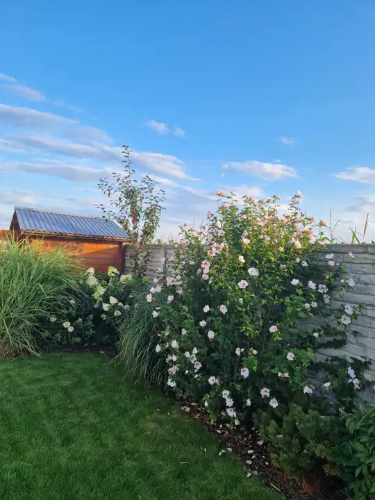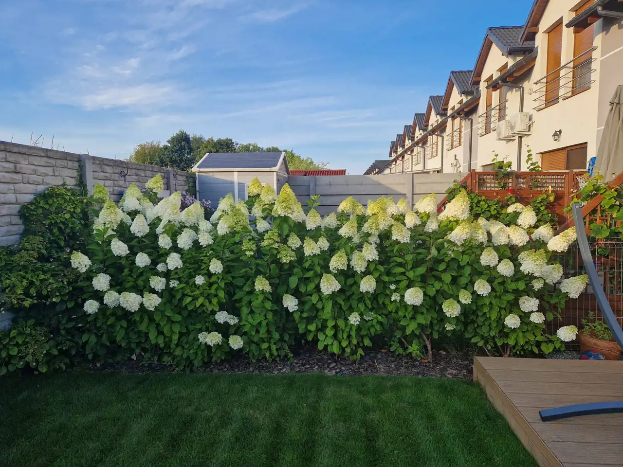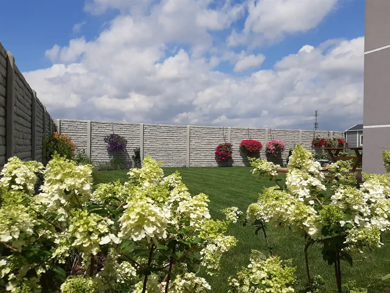 Ogród zadbany z piękną zielenią, zadbanym trawnikiem, krzewami i kwiatami wielorocznymi.