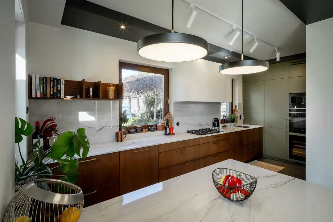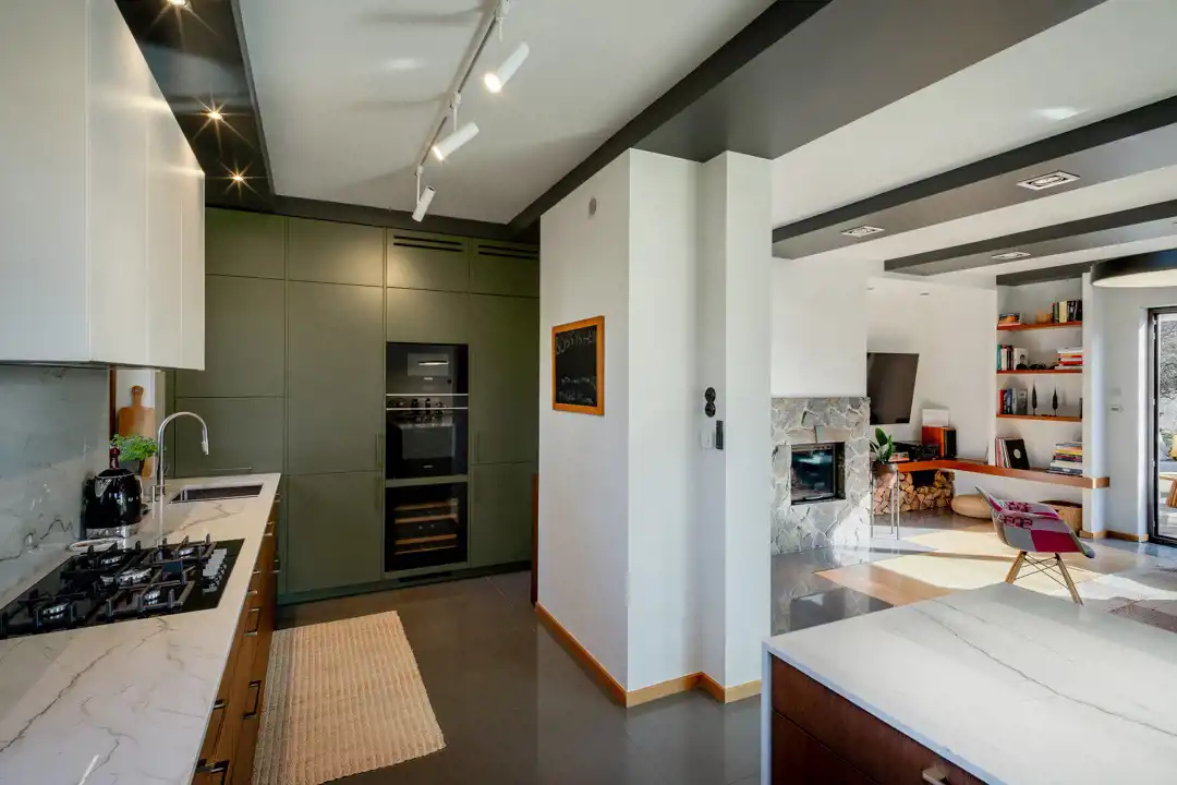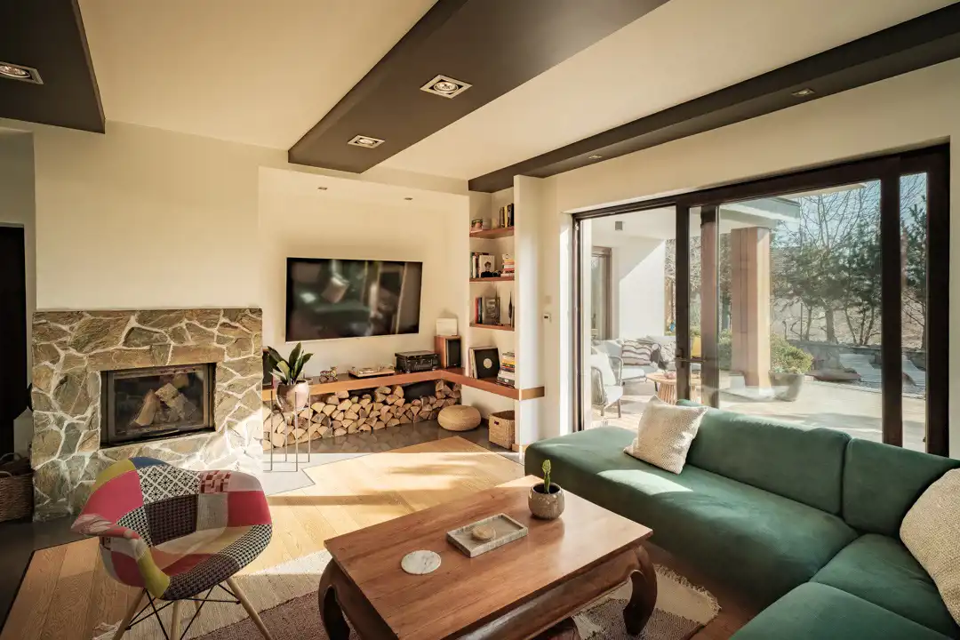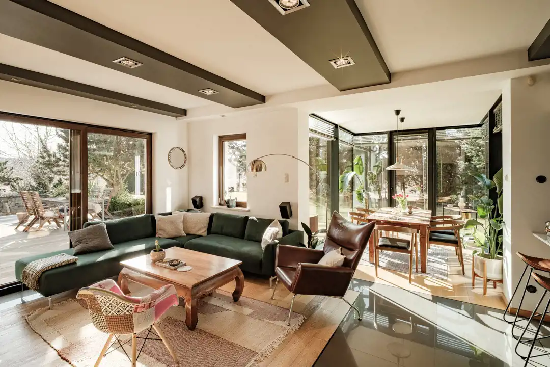 Sercem domu jest przestronny salon z kominkiem z płaszczem wodnym, połączony z otwartą kuchnią i jadalnią. Jadalnia znajduje się w całkowicie przeszklonym ogrodzie zimowym, dzięki czemu wnętrze jest doskonale doświetlone i otwarte na widok ogrodu.