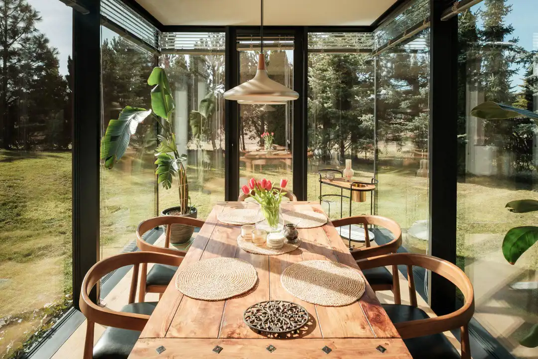 - Przeszklona jadalnia w ogrodzie zimowym z widokiem na ogród
