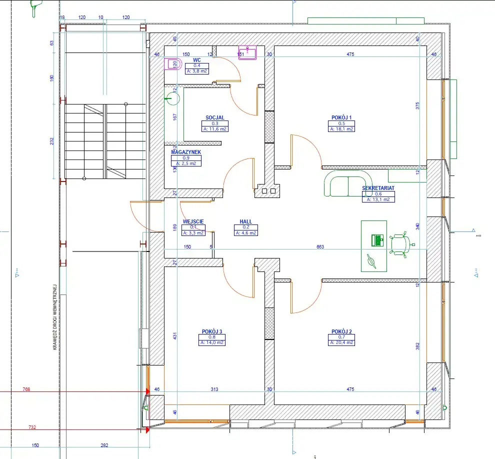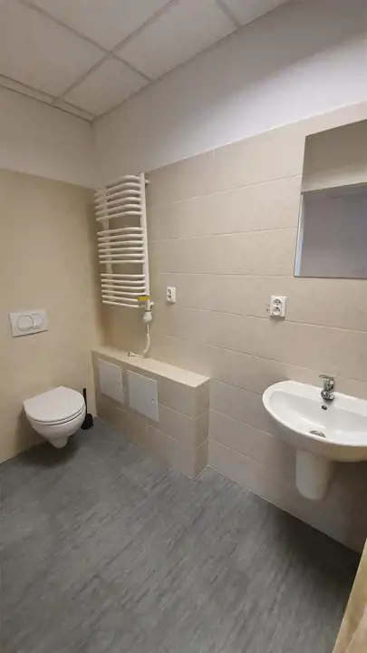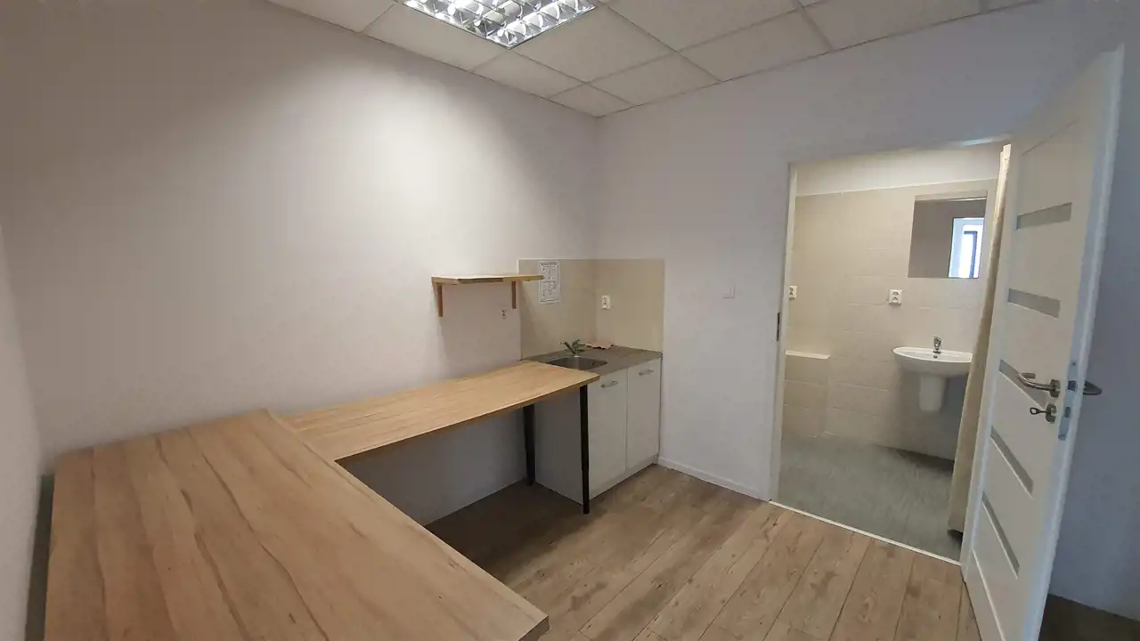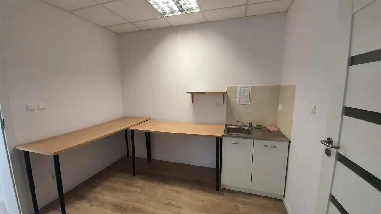 Powierzchnia lokalu ok. 91m2, na co składają się przedsionek, hall, pomieszczenie socjalne z kuchnią i magazynkiem, toaleta, korytarz/sekretariat oraz trzy sporej wielkości niezależne pomieszczenia.