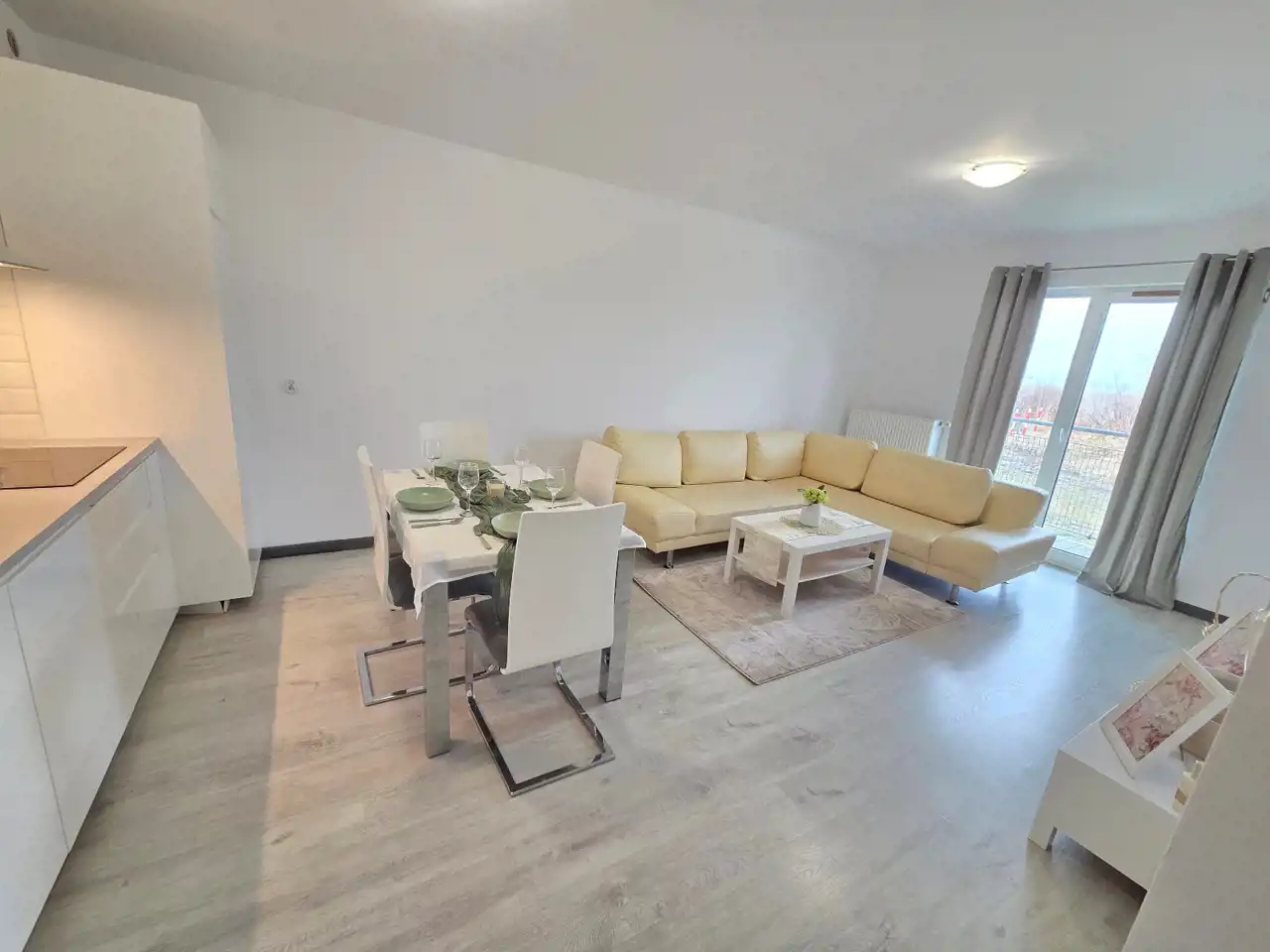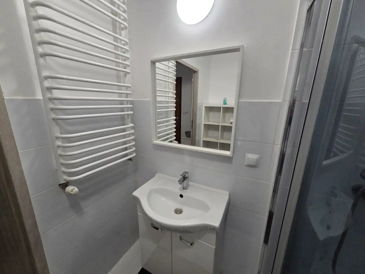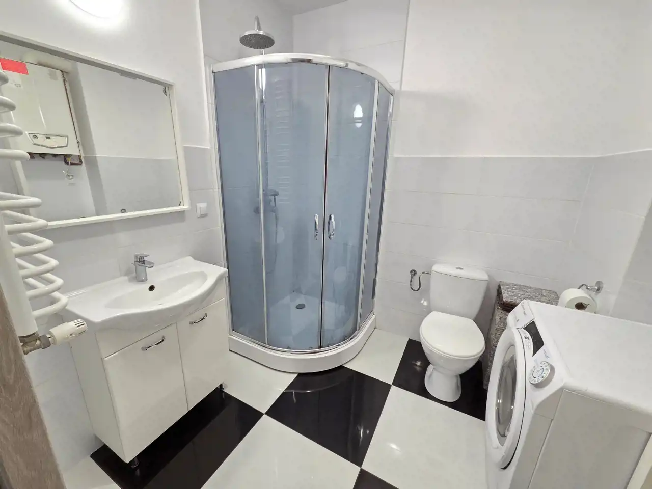 Standard wykończenia: ściany w pokojach i na przedpokoju malowane na biało, na podłogach panele. Aneks kuchenny wyposażony w zabudowę oraz sprzęt AGD (lodówko - zamrażarka, płyta elektryczna, okap, piekarnik, zmywarka). Łazienka razem z wc, wyłożona płytkami ceramicznymi, wyposażona w kabinę prysznicową, umywalkę z szafką, toaletę oraz pralkę automatyczną. Okna PCV, drzwi zewnętrzne i wewnętrzne w okleinie drewnianej. Balkon wyłożony deską drewnianą.