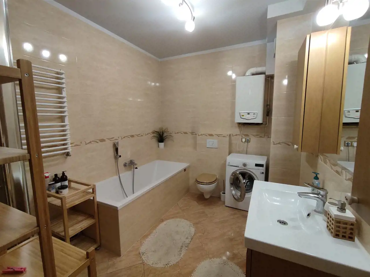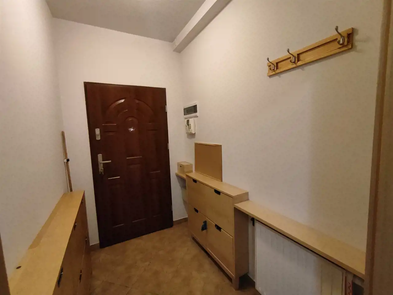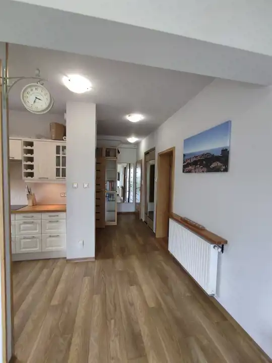 Na podłogach: łazienka i korytarz - płytki, kuchnia, salon i dwa pokoje - wysokiej jakości drewniany panel.