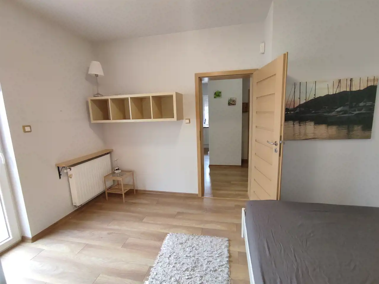 Wiatrołap (3,42 m2), łazienka (8,2 m2), jedna sypialnia (10,0 m2), druga sypialnia z wyjściem na taras (11,9 m2), salon z wyjściem na taras (18 m2), oraz kuchnia (ok 8 m2).